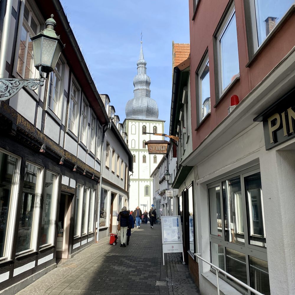 Zum Glück war die Lippstädter Innenstadt nahezu narrenfrei. Hier fühlte ich mich nicht mehr fremd im eigenen Land und begann gewohnt interessiert einen historischen Rundgang. Der Bernhardbrunnen unweit des Bahnhofs stieß mich dabei sogleich zu den Wurzeln der mittlerweile von rund 69.000 Seelen besiedelten Stadt. Denn dieser Brunnen wurde 1914 als Denkmal zu Ehren des Stadtgründers Bernhard II. zur Lippe errichtet. Der Adlige hatte mit dem Hermelinghof auf dem heutigen Stadtgebiet seine Burg (mittelalterlicher Stammsitz des Hauses Lippe) und gründete Lippstadt im späten 12. Jahrhundert als erste Planstadt Westfalens (Quellenlage mal wieder etwas dürftig). Sein den Brunnen krönendes Antlitz ist nebenbei das Gruppenlogo der hiesigen Ultragruppe Los Aliados.