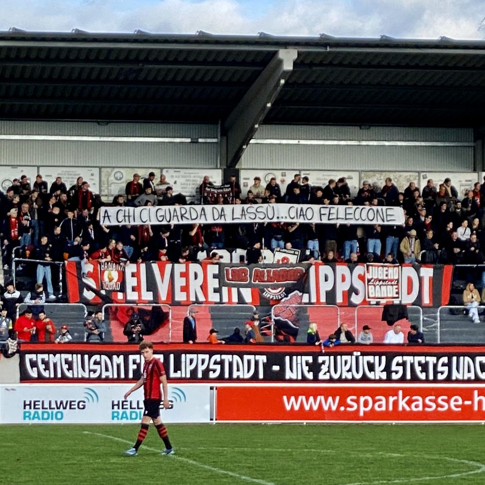 Ich nahm den neuen Spielstand nun als Signal wieder die Perspektive zu wechseln und wurde wenig später an meinen kürzlichen Besuch in Cava de‘ Tirreni erinnert. Leider jedoch aus einem traurigen Anlass. Die Lippstädter Szene, die seit längerem zu Teilen der Curva Sud von Cavese freundschaftliche Kontakte pflegt, bedauerte einen unter der Woche ereigneten Todesfall in Cava mit den Worten „A chi ci guarda da lassù, Ciao Feleccone“ (Für diejenigen, die uns von dort oben beobachten…).