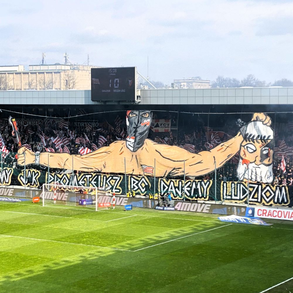 Die zwei anwesenden ehemaligen Studenten der LUH-Althistorikerin Wagner-Hasel, die nebenbei für 65 Złoty (ca. 15 €) pro Person auf der Haupttribüne saßen, waren sehr angetan von diesem mythologischen Motiv und hoben ihre Daumen. Da zollte die Kurve auf archaische Weise gewissermaßen auch den akademischen Gründervätern ihres Vereins Tribut (KS Cracovia wurde am 13. Juni 1906 als Akademicki Klub Footballowy gegründet und war lange Zeit vom Krakówer Bildungsbürgertum geprägt). Zugleich gab man dem Rivalen aber vielleicht eine Steilvorlage für entsprechende Repliken. Schließlich gefiel Zeus überhaupt nicht, dass Prometheus den Menschen das Feuer gebracht hatte und bestrafte den ungehorsamen Titan auf qualvolle Weise. Ich sehe den Pseudoprometheus der Jude Gang vor meinem geistigen Auge bereits an eine Säule gefesselt, während ihm ein Adler die Leber aus dem Leib reißt. Sorry für den Spoiler…