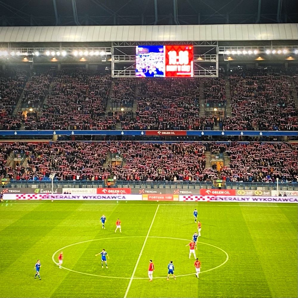 Immerhin wurde der Weg zum Stadion Miejski im. Henryka Reymana zwangsläufig ein schöner Abendspaziergang durch die malerische Altstadt, der mich binnen 45 Minuten zur 1954 in der Ulica Reymonta eröffneten Spielstätte führte (seit 2008 nach der Wisła-Legende Henryk Reyman benannt). Dort nahm ich am Presseeingang meine Akkreditierung entgegen und freute mich über den relativ großen Andrang an den regulären Zuschauereingängen. Für den 2022 aus der Ekstraklasa abgestiegenen dreizehnfachen Meister läuft es gerade wieder ganz gut. Man ist in der Spitzengruppe der Liga (gegenwärtig 5.Platz) und hegt somit noch berechtigte Aufstiegshoffnungen. Zugleich ist man im polnischen Pokal ins Halbfinale eingezogen, welches man am 4. April gegen den Erstligisten Piast Gliwice austragen wird.
