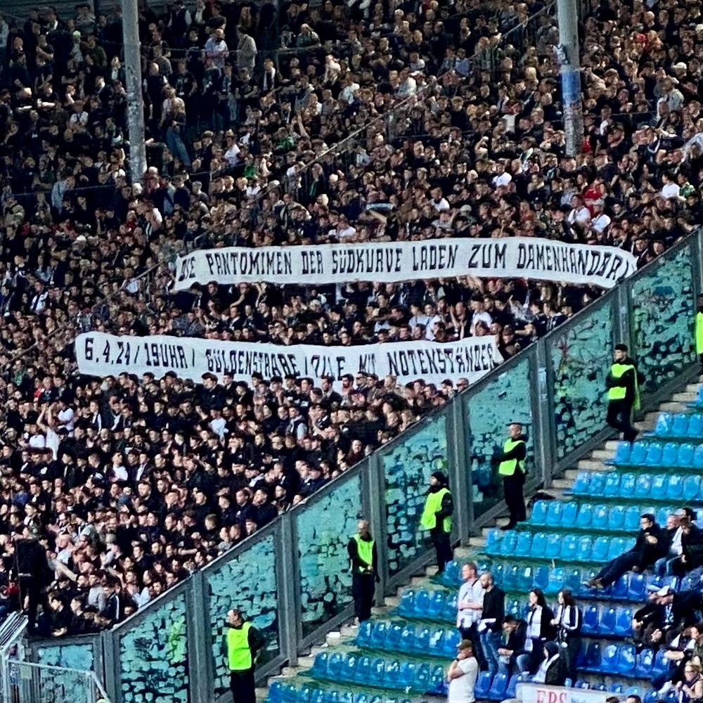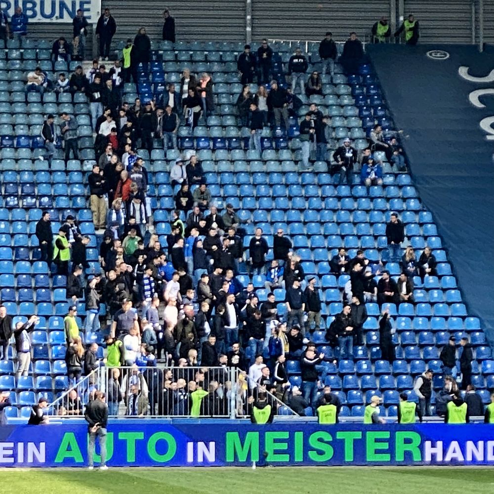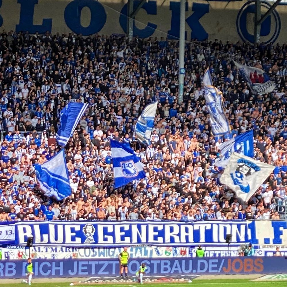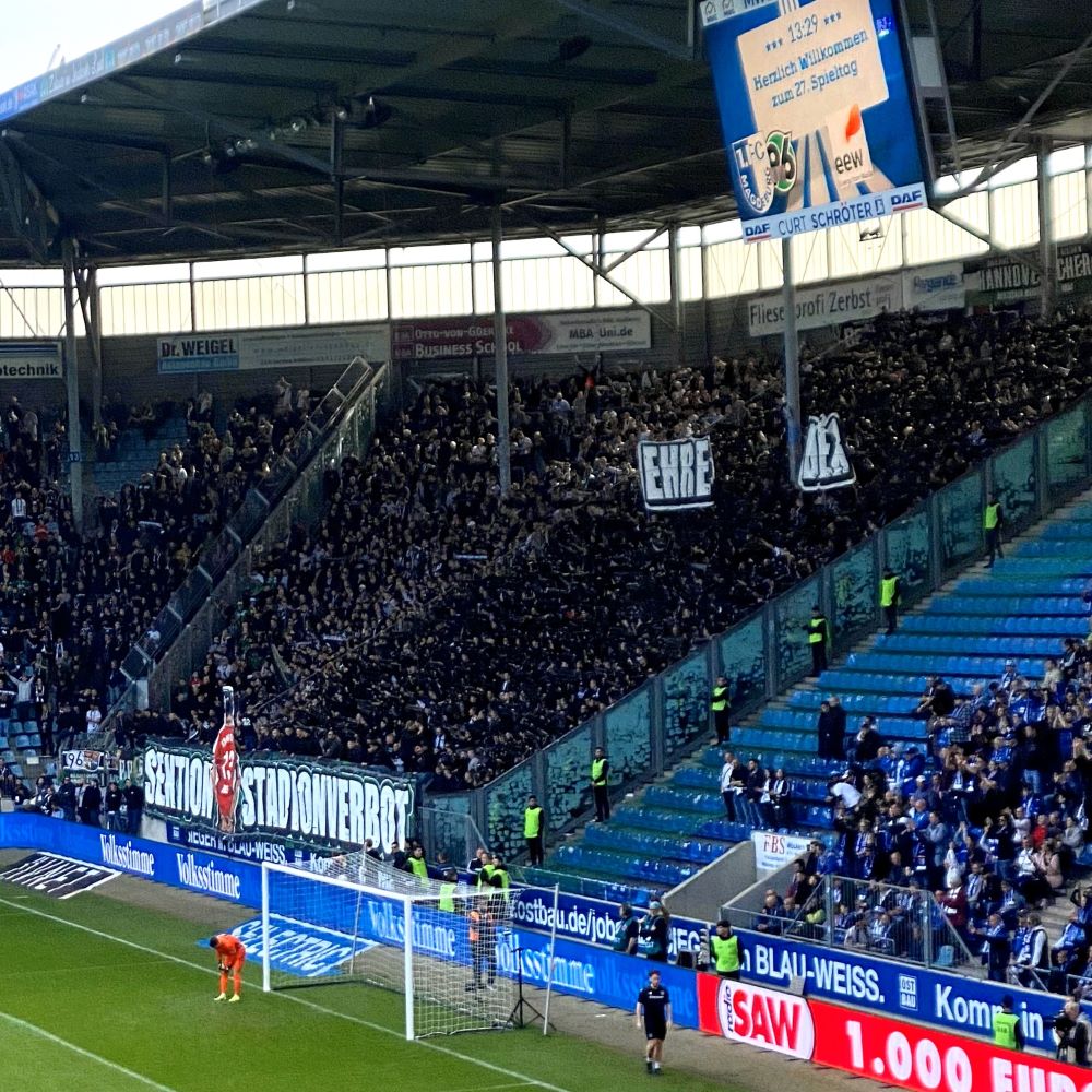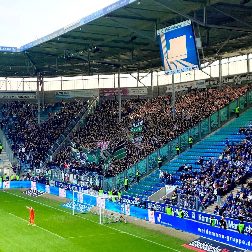 Als die Becher geleert waren, läuteten die Domglocken mal wieder zur vollen Stunde. Es war 13 Uhr und damit höchste Zeit auch die letzten 1,6 km bis zum Stadion zu meistern. Dort trennten sich vorerst unsere Wege, weil wir uns in unterschiedlichen Stadionbereichen mit Tickets versorgt hatten. Da heute nicht mit einer Pyroshow im Gästesektor zu rechnen war, verzichtete ich diesmal auf die gute Fotoposition, aber zugleich schlechte Gesellschaft auf der Gegengerade in Block 12 (Vgl. Magdeburg 08/2022). Stattdessen saß ich mit den WAGs der Spieler und tatsächlich auch zwei bekannten Nasen aus der hannoverschen Fanszene auf der Haupttribüne in Block 21.