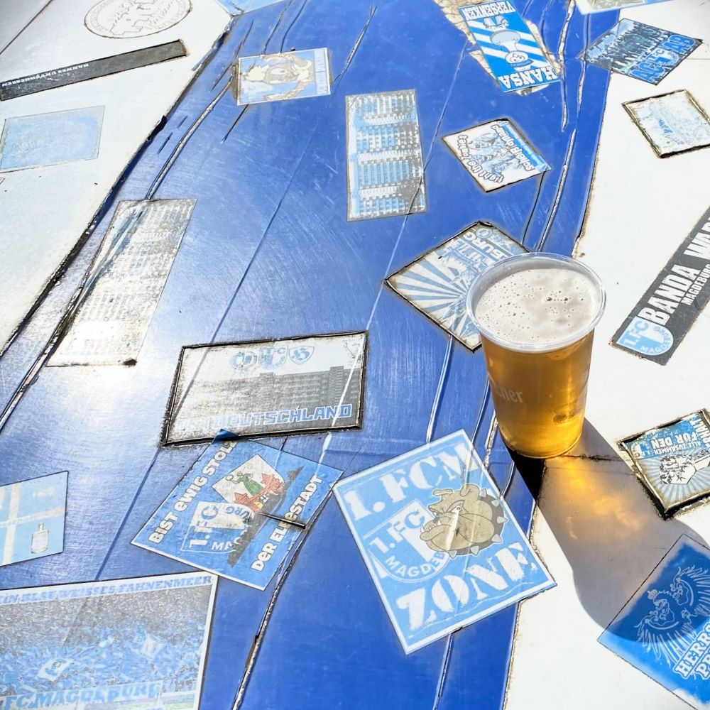 Bei bestem Frühlingswetter und noch 96 Minuten Zeit bis zum Anpfiff, ging es selbstredend zu Fuß zum 3,2 km vom Hauptbahnhof entfernten und nach dem einstigen Erfolgstrainer Heinz Krügel benannten Stadion (u. a. gewann der FCM in Krügels Ära 1974 den Europapokal der Pokalsieger). Beim Spaziergang stellten wir zunächst fest, dass die Elbe immer noch die selbe ist und außerdem an jenem Fluss ein kleiner Ausschank zur Einkehr einlädt. So gönnten wir uns noch frisch gezapftes Pils im kleinen Biergarten von Silkes Zolleck.