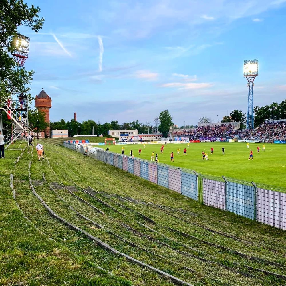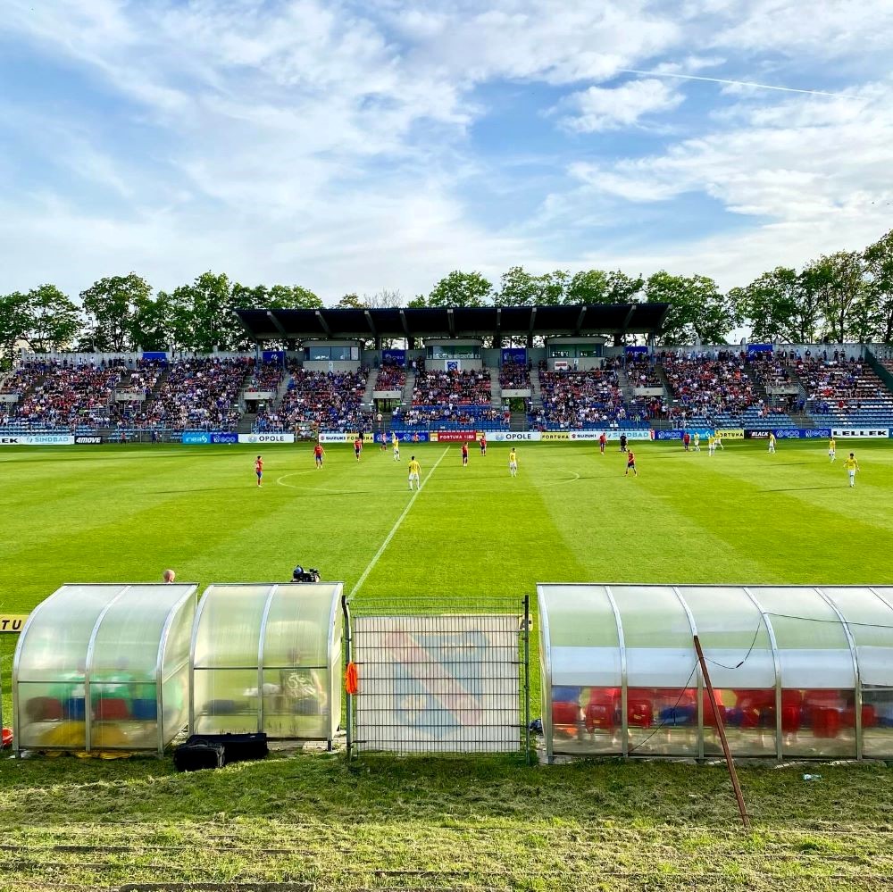 Nach dem Essen machte ich einen gut halbstündigen Spaziergang zum städtischen Stadion. Dort nahm ich meine Akkreditierung entgegen und freute mich schon beim Betreten des Runds über meine Entscheidung für dieses Spiel. Denn so viele Möglichkeiten, um diese 1930 eröffnete Sportstätte zu besuchen, hätten sich für mich wohl nicht mehr ergeben. In Opole steht nämlich ein neues Fußballstadion kurz vor der Fertigstellung und das alte Schmuckstück soll 2025 zugunsten eines neuen Aquaparks abgerissen werden.