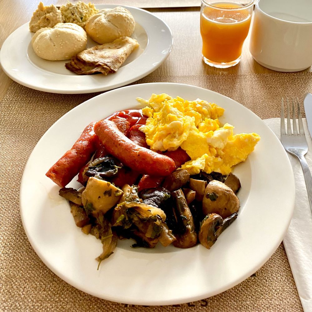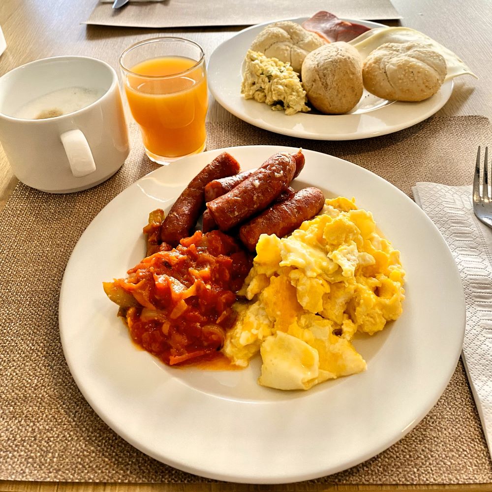 Nach Abpfiff schaute ich den Gästen noch kurz beim Feiern zu und spazierte anschließend gemütlich zum Hotel. Es ging mal früh ins Bett, so dass ich mich am Dienstagmorgen sehr ausgeschlafen und auch ein bisschen ausgehungert über das Frühstücksbuffet hermachen konnte. Heute hatten die Würste und das Rührei anstatt Letscho übrigens eine Pilzpfanne als Nachbarn und außerdem lächelten mich die kleinen, süßen Crêpes in der Warmtheke an. Dazu noch zwei kleine Sesambrötchen mit pikanten Aufstrichen und ich war bereit für die Aufgaben des neuen Tages.