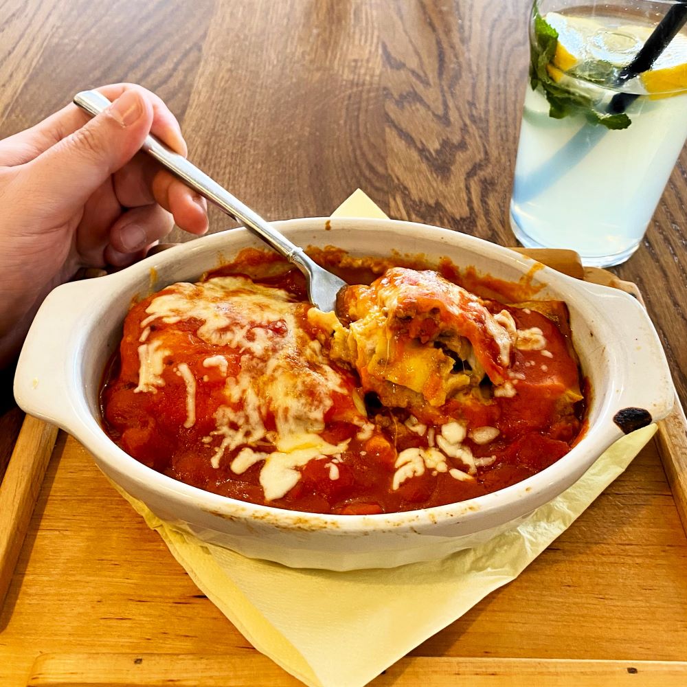 Kurz nach 15 Uhr fuhr ich dann wieder zurück in die Stadt und bemerkte das Knurren meines Magens. Ich beschloss also nachmittags endlich die nächste Mahlzeit zu konsumieren und suchte dafür das Bistro Manekin auf. Eine polnische Kette, die sich Pfannkuchen in allen möglichen Variationen auf die Fahnen geschrieben hat und mir ihre Lasagne servieren durfte. Diese folgt zwar grundsätzlich der klassischen Rezeptur, allerdings ersetzen dünne Pfannkuchenschichten die sonst obligatorischen Nudelplatten. Zusammen mit einer hausgemachten Limonade und gut 10 % Trinkgeld wurde ich übrigens nur 40 Złoty (ca. 9,50 €) ärmer.