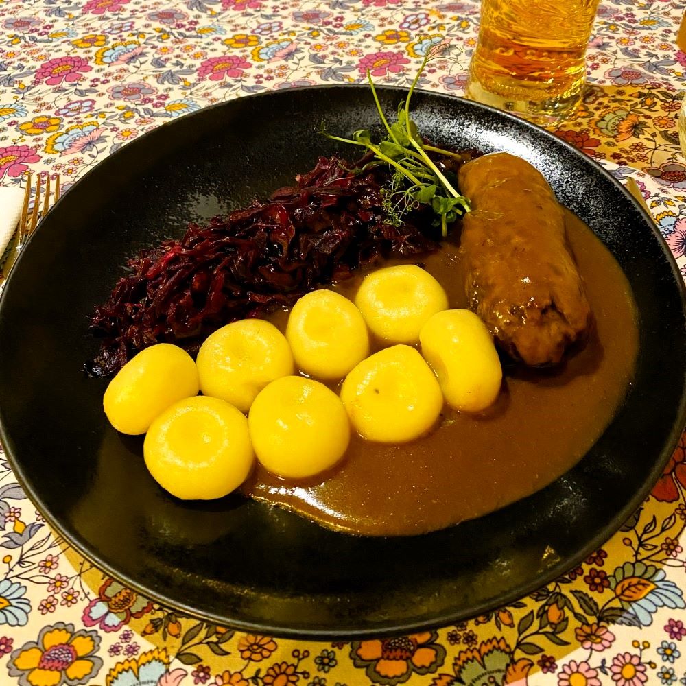 Auch die mir als Hauptgang gereichte Rinderroulade ließ keine Wünsche offen. Zartes Rindfleisch, deftig-würzige Füllung, kräftige Sauce, herzhafte Kartoffelklöße und knackiger (leicht säuerlicher) Rotkohl. Herz, was willst du mehr? Zusammen mit einem halben Liter Żywiec vom Fass wurden für dieses schlesische Schlemmerfest übrigens nur 108 Złoty (ca. 25 €) fällig. Die werte Tati verkauft ihre Kochkünste eindeutig unter Wert. Zumindest nach deutschen Maßstäben.