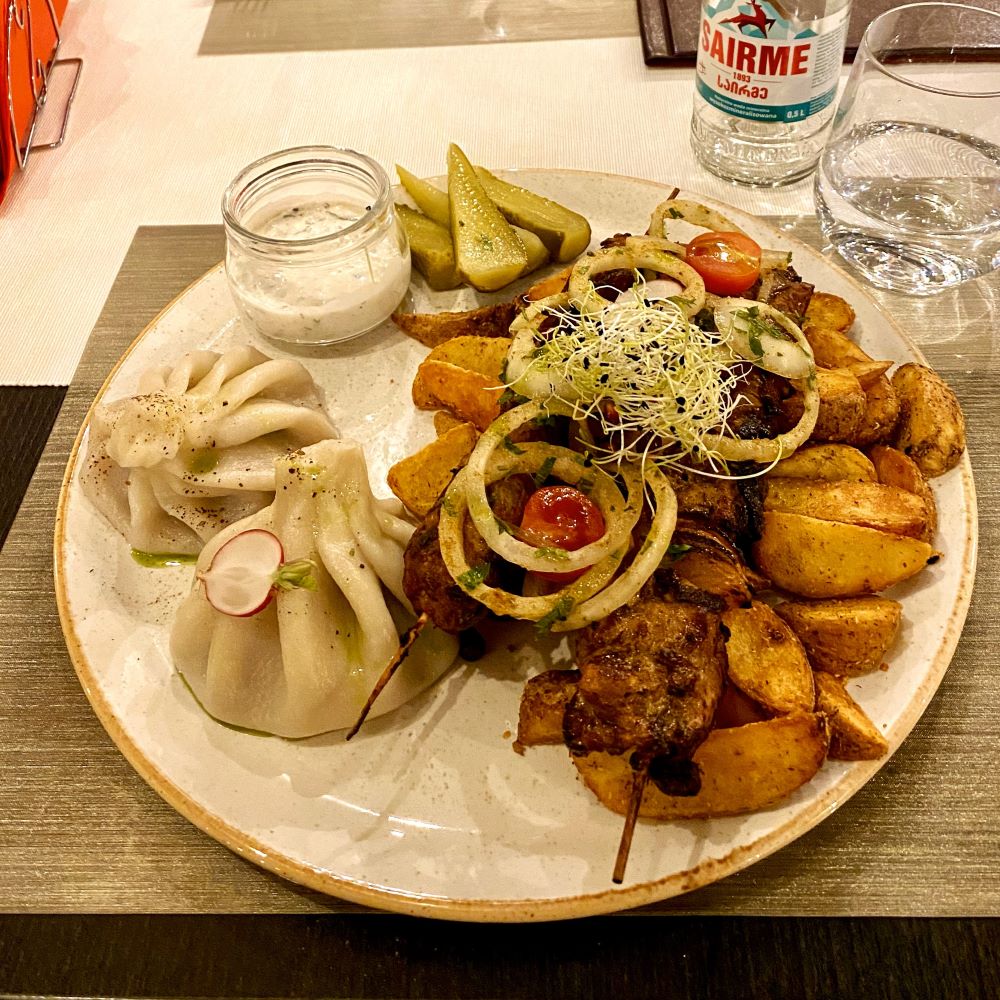 Die Vorspeise machte richtig Lust auf mehr, aber so recht entscheiden konnte ich mich bei den Hauptgängen nicht. Die Bedienung empfahl mir nun die Grillplatte für zwei. Ich dachte erst, ihr geschultes Auge hat sofort erkannt, dass ich ganz gerne mal für zwei esse. Aber nein, sie könnten die Platte auch für eine Person zum halben Preis machen, war ihre Reaktion auf meinen irritierten Blick. Da ging mir sofort mit heller Miene ein “Bardzo dobrze” über die Lippen und wenig später wurden mir verschiedene georgische Spezialitäten serviert. Ein pikanter Hackspieß, ein saftiger Schaschlikspieß und zwei Chinkali (mit Fleisch und Brühe gefüllte Teigtaschen) waren die köstlichen Hauptprotagonisten auf dem Teller. Aber auch die würzig-knusprigen Kartoffelecken und die Gemüsegarnitur waren ein Genuss. ein guter georgischer Koch weiß einfach mit Gewürzen und Kräutern umzugehen.