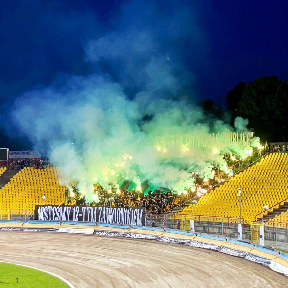 Der Ausgleich war zugleich das letzte Tor dieses Spiels, aber die wahren Höhepunkte des Abends standen mir dennoch erst bevor. Ich hatte den sachdienlichen Hinweis bekommen, dass es ab der 64. Minute eine besonderes Showprogramm in der Kurve geben würde und hatte mich dementsprechend ab der 60. Minute exponiert unter dem Dach der Haupttribüne positioniert. Von dort kamen mir tatsächlich zeitnah die üblichen Vermummungsmassnahmen und bald auch die erste Pyroshow des Abends vor die Linse. Grüne Fackeln umrahmten eine große Trikotblockfahne mit der Rückennummer 12. Begleitet von der Botschaft „NIE TRAKTUJ NAS JAK „PUBLIKĘ“ JESTEŚMY 12-TYM ZAWODNIKIEM“ (Behandelt uns nicht wie „Publikum“, wir sind der 12. Mann).