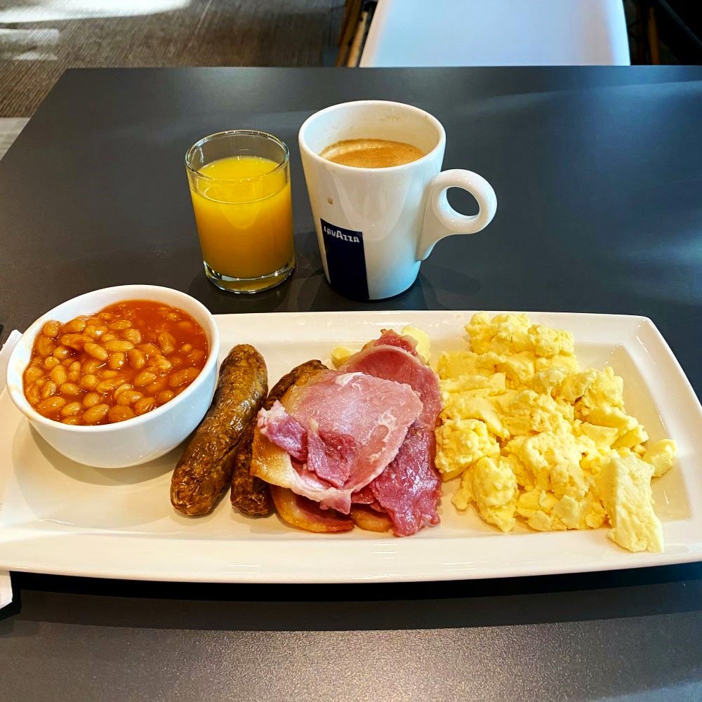 Am Montagmorgen wollte ich mich nach dem Aufwachen sogleich auf das Frühstücksbuffet meines Hotels stürzen. Allerdings war ich gegen 8 Uhr nicht nur der einzige Gast dort, sondern die Warmtheke war leer und vor allem auch blitzblank sauber. Doch noch bevor ich empört nach dem Geschäftsführer verlangen konnte, wurde ich proaktiv vom Personal aufgeklärt, dass Hot Food für die Gäste aufgrund der geringen Hotelauslastung heute frisch auf Bestellung zubereitet wird. Da beauftragte ich doch gern Sausages, Scrambled Eggs, Bacon und Baked Beans und vertrieb mir die Wartezeit mit einem Joghurt.