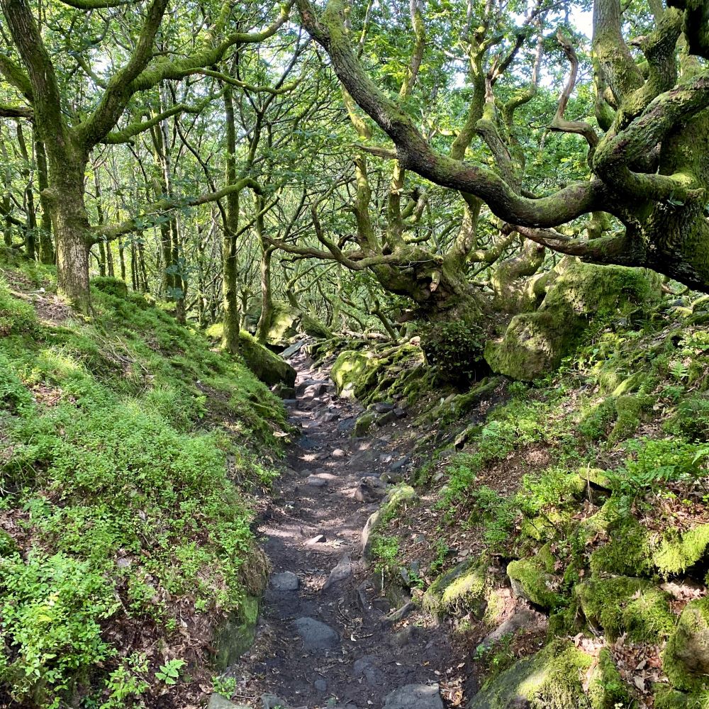 Auf meinem Wanderkilometer 4,3 begann schließlich mein Abstieg hinunter ins Tal. Zwischen den Felsen führte ein Geröllweg zunächst sehr steil hinab, doch nach etwa 500 Metern mündete dieser in ein Waldstück mit gefühlt tausende Jahre alten Bäumen. Die knorrigen Riesen schienen regelrecht den mit Moos und Heidekraut bedeckten Felsen entwachsen zu sein und formten mit ihren Ästen ein Dach über dem schmalen und steinigen Wanderpfad.
