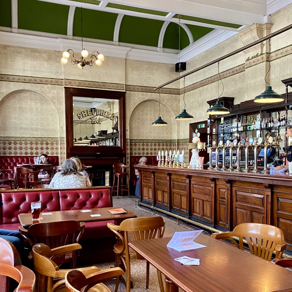 Deshalb marschierte ich um 16:30 Uhr wieder zum Bahnhof. Dort musste ich aber leider erfahren, dass mein gebuchter Zug nach Widnes um 16:43 Uhr ausfällt. Erst 17:41 Uhr könne ich fahren… Welch hocherfreuliche Nachricht! Denn die pünktliche Ankunft zum Anpfiff würde auch mit dem Folgezug klappen, es winkte abermals eine Rückerstattung des Fahrpreises in Höhe von £ 25.30 (ca. 30 €) und Sheffield kann obendrein einen der angeblich besten Pubs Englands als Bahnhofskneipe vorweisen.