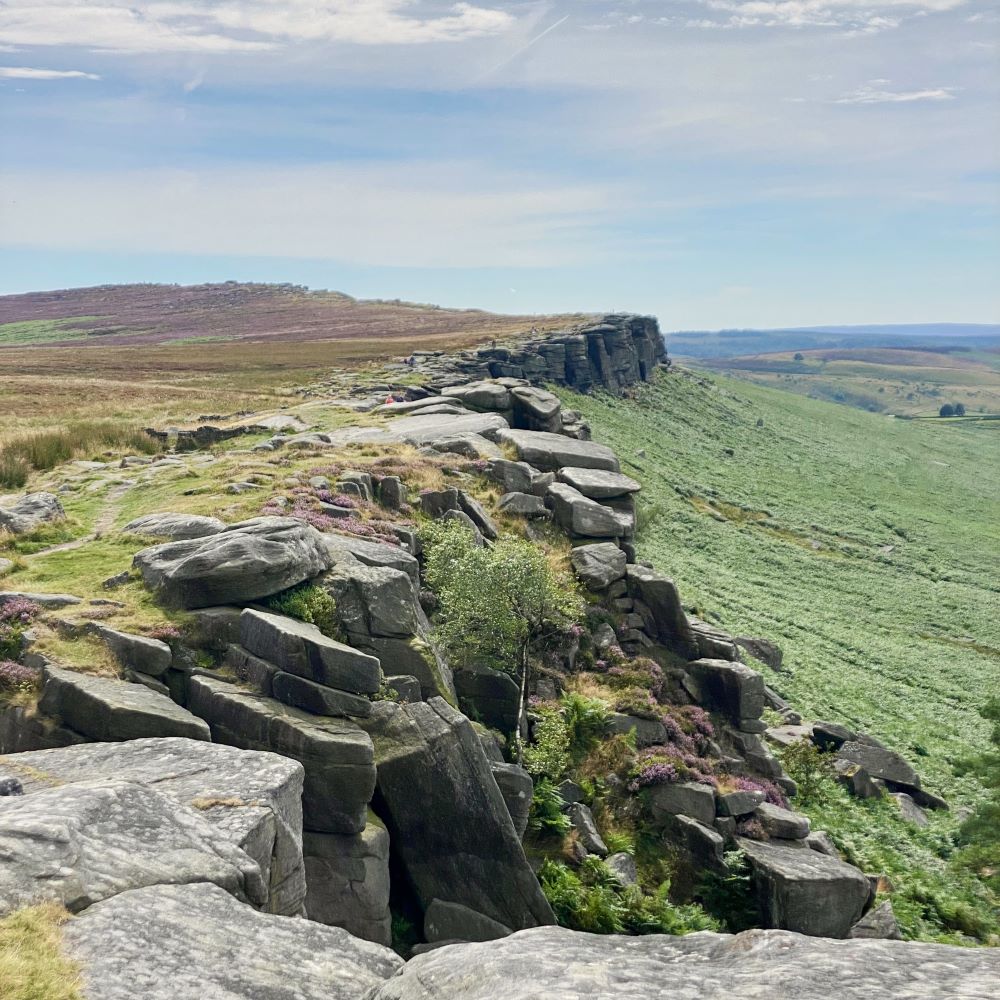 Ich war nun von 160 auf 420 m ü. NN gestiegen und genoss zwischen dem Gipfel Higger Tor und der Felswand Stanage Edge ein herrliches Panorama. Dann marschierte ich schnurstracks auf die Felsen besagter Egde zu. Wie bei der 24 Stunden zuvor abgewanderten Bamford Edge, handelt es sich dabei um eine steile und kilometerlange Felswand aus Sandstein.