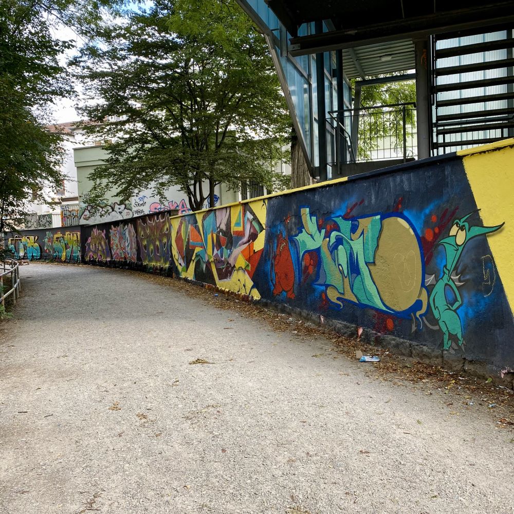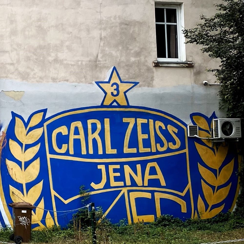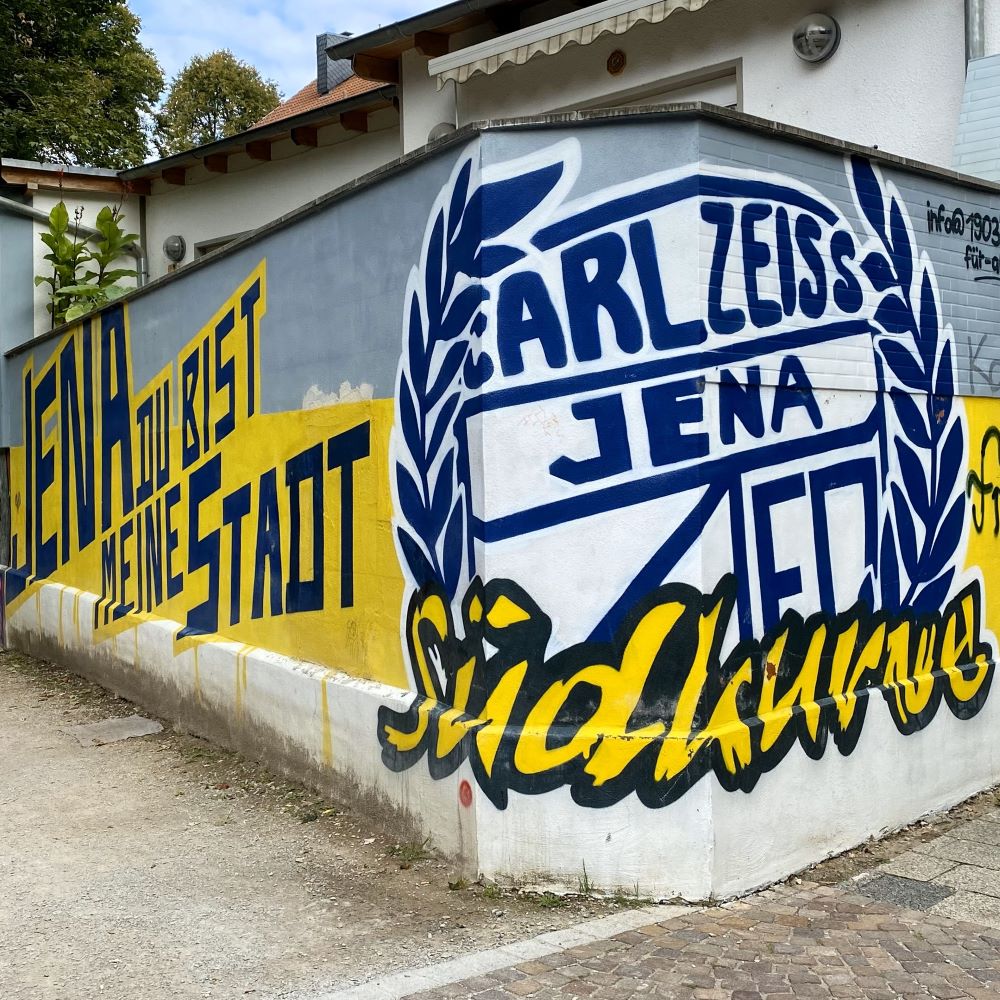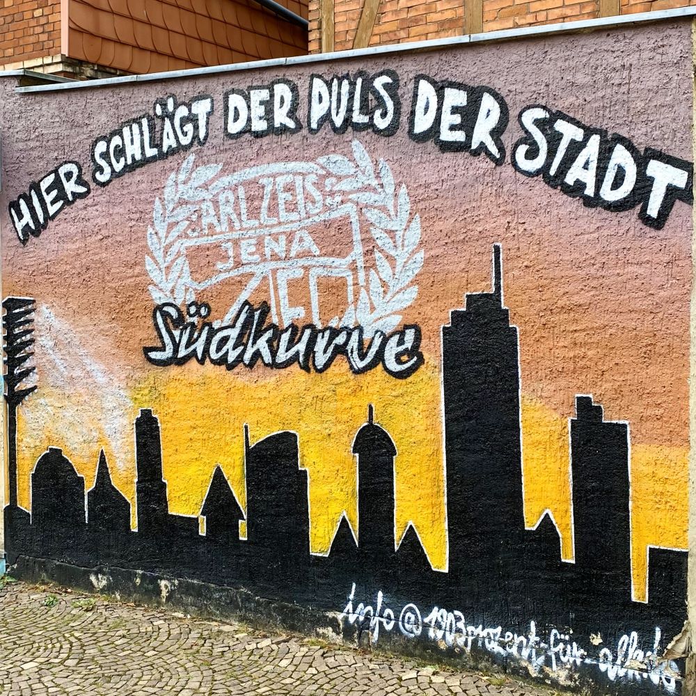 Vom Normannenhaus stieg ich über Treppen hinab zur Altstadt und passierte dabei u. a. das 1903 eröffnete Volkshaus und das Ernst-Abbe-Denkmal (1911) am Carl-Zeiss-Platz. Zeiss und Abbe… zwei Namen ich denen man in Jena definitiv nicht vorbeikommt. Aber bevor ich mich richtig in die Altstadt und Stadtgeschichte vorwagte, machte ich noch einen Schwenker nach Nordwesten. Denn am Lauf der Leutra befindet sich in der Jahnstraße eine Hall of Fame mit etlichen Graffiti. Ferner entdeckte ich im dortigen Kiez rund um die Universitätsklinik einige Wandbilder und Graffiti, die dem örtlichen Fußballclub oder dessen Fanszene gewidmet waren.