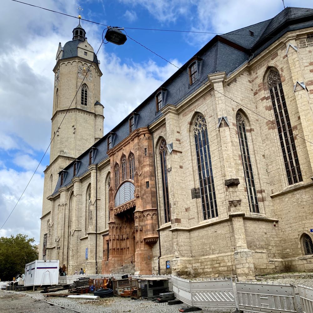 Von Stadtmauer und JenTower war es nun auch nicht mehr weit zur Stadtkirche St. Michael. Diese spätgotische Hallenkirche entstand ab 1380 und wurde im 16. Jahrhundert vollendet. Da genau an diesem Wochenende 500 Jahre Reformation in Jena gefeiert wurde, konnte ich mich im relativ schmucklosen Inneren der protestantischen Hauptkirche auf Schautafeln über Luthers Wirken an diesem Ort informieren. 1524 predigte der Reformator erstmals in St. Michael und danach war die Reformation am Fuße der Kernberge offenbar nicht mehr aufzuhalten.