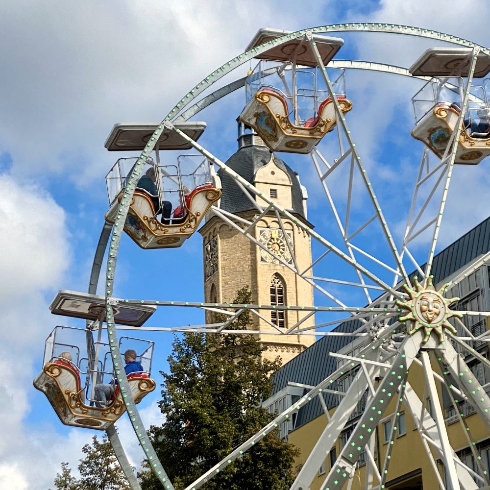 Als nächstes stand der historische Marktplatz mitsamt dem Rathaus (14. Jahrhundert) auf meiner Liste. Allerdings sollte an diesem Wochenende nicht nur die Reformation, sondern auch das Altstadtfest in Jena gefeiert werden. Entsprechend waren die Sichtachsen und Fotoperspektiven mit Fahrgeschäften und Fressbuden zugestellt. Aber man kann als Tourist nun mal nicht immer Glück haben.