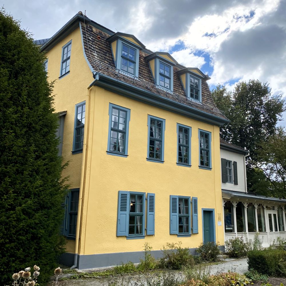 Statt Zuckerwatte zu kaufen oder Riesenrad zu fahren, orientierte ich mich nun so langsam zum Ernst-Abbe-Sportfeld. Dabei passierte ich noch das 1921 von Walter Gropius entworfene Theaterhaus (dessen Architektur mich wieder an mein Juniwochenende in Dessau erinnerte) und Friedrich Schillers einstiges Gartenhaus. Der von 1789 bis 1799 in Jena wirkende Dichter und Denker hat in diesem Häuschen seinen Wallenstein geschrieben und auch Teile von Maria Stuart und Die Jungfrau von Orleans sollen hier verfasst worden sein. Im Garten steht ferner ein alter Steintisch, an dem Schiller oft mit Goethe zum Gedankenaustausch zusammengesessen hat.