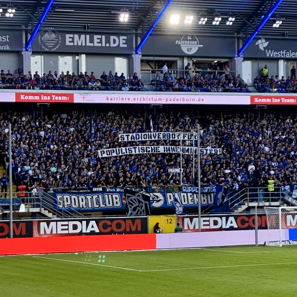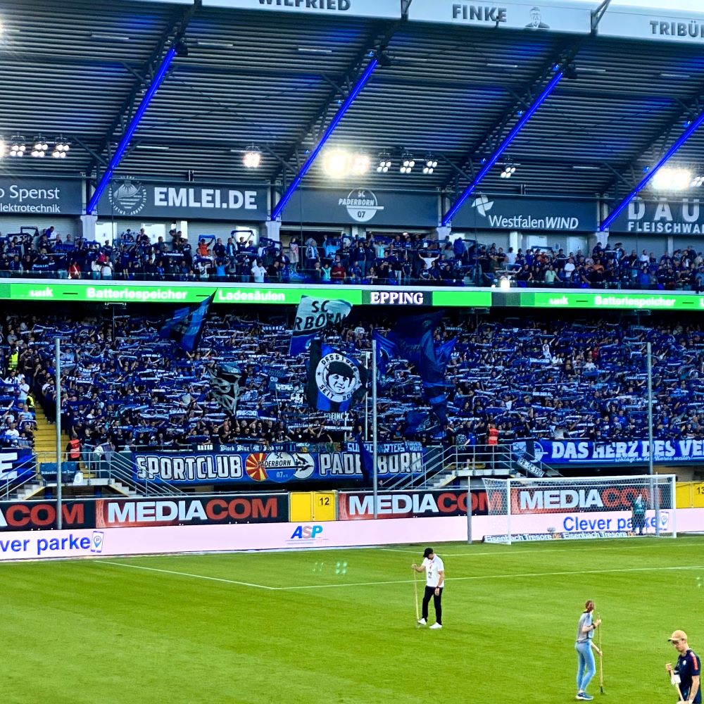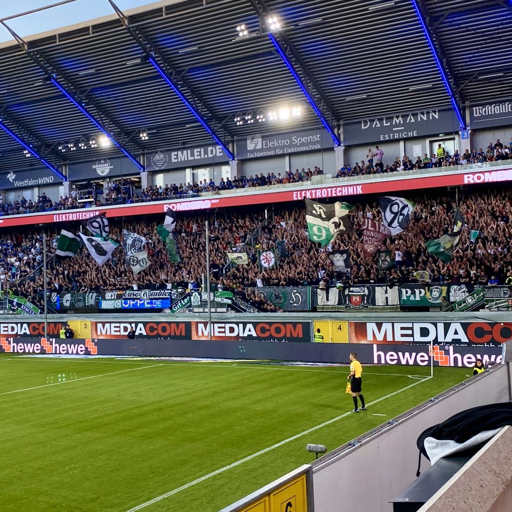 An die Pader reist von der Leine immer ein ganzes Geschwader… Daher graute mir eigentlich vor der S-Bahn-Fahrt ins südliche Ostwestfalen. Überhaupt reizte diese Auswärtsfahrt so gut wie gar nicht und der widerliche politische Populismus in Sachen kommendes Niedersachsenderby (siehe Hannovereint) sorgte ebenfalls eher für Frust als Lust. Aber im Zweifelsfall lasse ich mir tausendmal lieber vom SC Paderborn, als von Daniela Behrens die Freude am Fußball nehmen. Also habe ich mir doch noch ein Ticket für die Gegengerade organisiert und mich nach Feierabend in die erstbeste S-Bahn gen Paderborn gesetzt. Wozu hat man schließlich dieses Deutschlandticket?