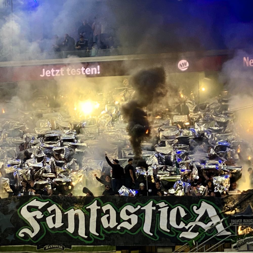 An der bernsteinfarbenen Bierspezialität nippend, beobachtete ich während Halbzeitpause vorfreudig die Choreovorbereitungen im Gästesektor. Bei Wiederanpfiff sollten silberne Folienfetzen glitzern und pyrotechnische Erzeugnisse leuchten. Betitelt war dieser Augenschmaus mit den Worten “Hannovera Fantastica” und dazu war am Zaun eine Abbildung von mutmaßlich jenem Magier zu sehen, der die verbotene Pyrotechnik der Ultras jedes Mal am Ordnungsdienst vorbei zaubert. Schön. Hat die Polizei da endlich mal ein Gesicht zu.
