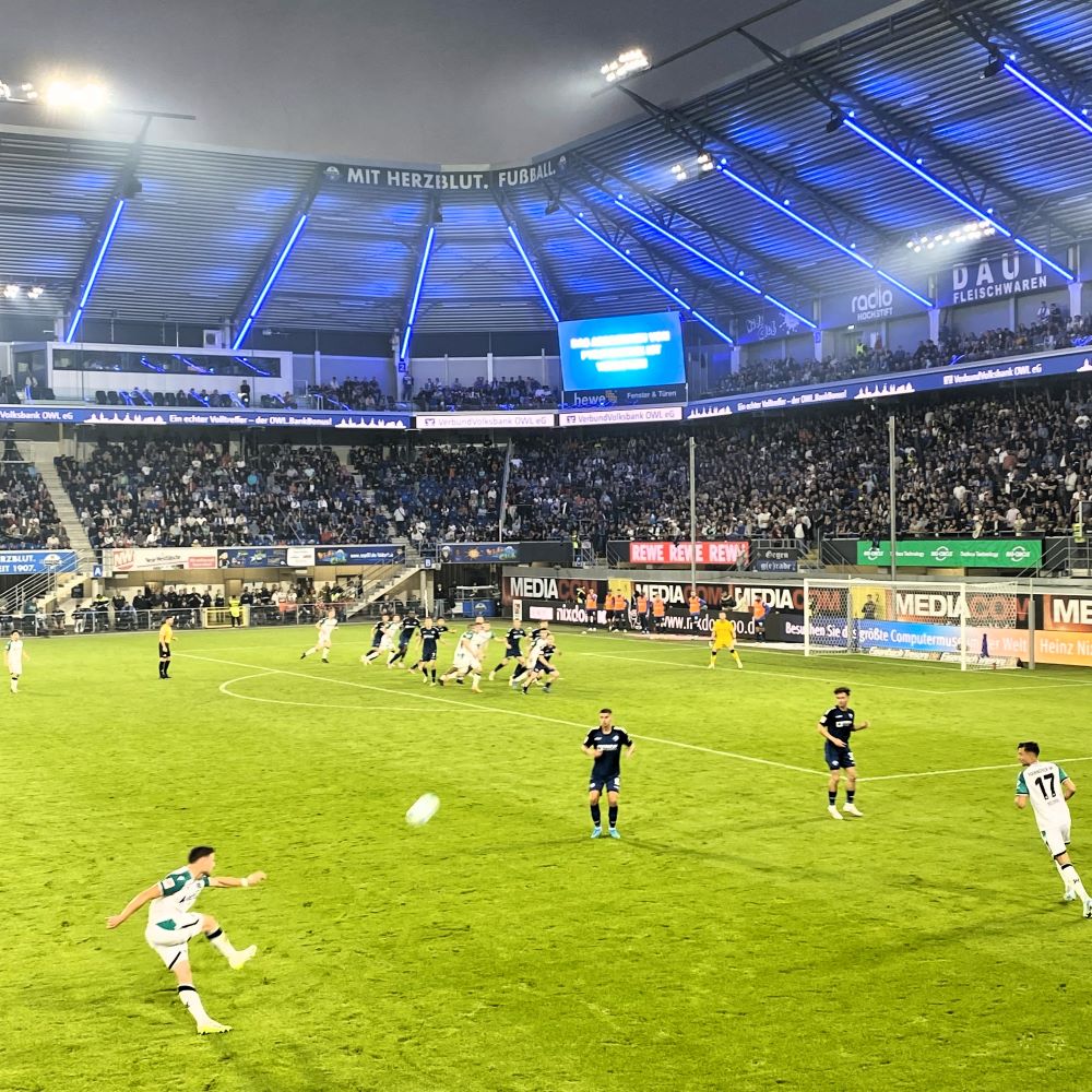 Vom Westerntor fahren ferner die Shuttlebusse zur Spielstätte des SC Paderborn 07 ab. Ich nahm kurz nach 17 Uhr einen davon und hatte auf dem Stadionvorplatz um exakt 17:30 Uhr ein Pilger Landbier in der Hand (0,5 l für 5 €). Das entpuppte sich als deutliches Upgrade zu Warsteiner in den Vorjahren. Auch sieht diese 2008 eröffnete Arena – die übrigens bereits den vierten Sponsorennamen trägt – durch den Oberrang mittlerweile etwas weniger nach Lagerverkauf eines Möbelhauses aus und ist nun tatsächlich optisch vom bisherigen Zwilling im polnischen Gliwice (Gleiwitz) zu unterscheiden. Aber wirklich schön ist das Ding trotzdem nicht und der Standort am Arsch der Heide bleibt auf ewig kacke.