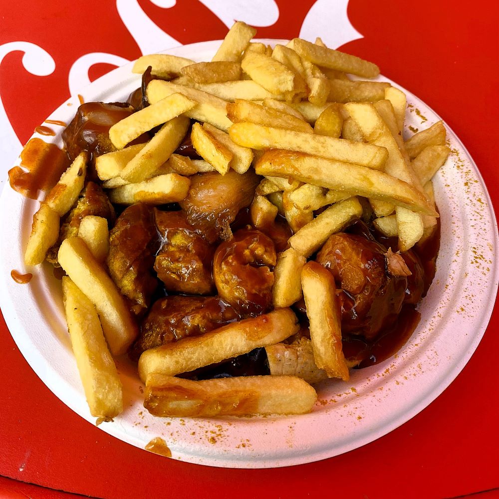 Außerdem eröffnete mir die 3,3 km lange Route die Möglichkeit eines kleinen Abendmahls im Kreuzviertel. Ich hielt also auf dem Weg die Augen auf und auf halber Strecke machte mich ein riesiges BVB-Wandbild auf einen direkt darunter beheimateten Imbiss namens Gourmet Stäbchen aufmerksam (siehe Titelbild). Dort gönnte ich mir für 9,90 € sozusagen die Spezialitätenplatte des Hauses. Eine Bratcurry und ein Schaschlikspieß wurden mir mit reichlich Sauce auf einen Pappteller gepackt, um anschließend unter einer Portion frisch frittierter Pommes frites begraben zu werden. Man hätte es sicher schöner anrichten können, aber hier stand ein Einzelkämpfer hinter der Imbisstheke und der Andrang war um 17:30 Uhr groß. Da möchte ich jetzt nicht das Gourmetstäbchen über jenem bemühten Schnellgastronomen brechen.