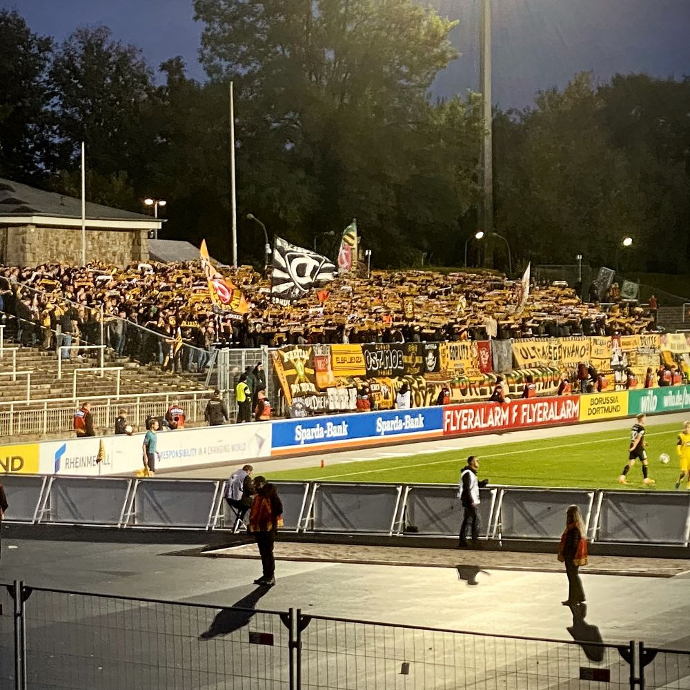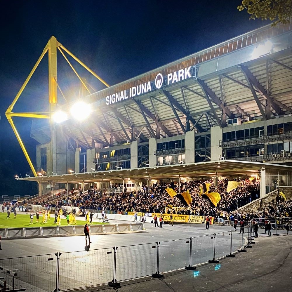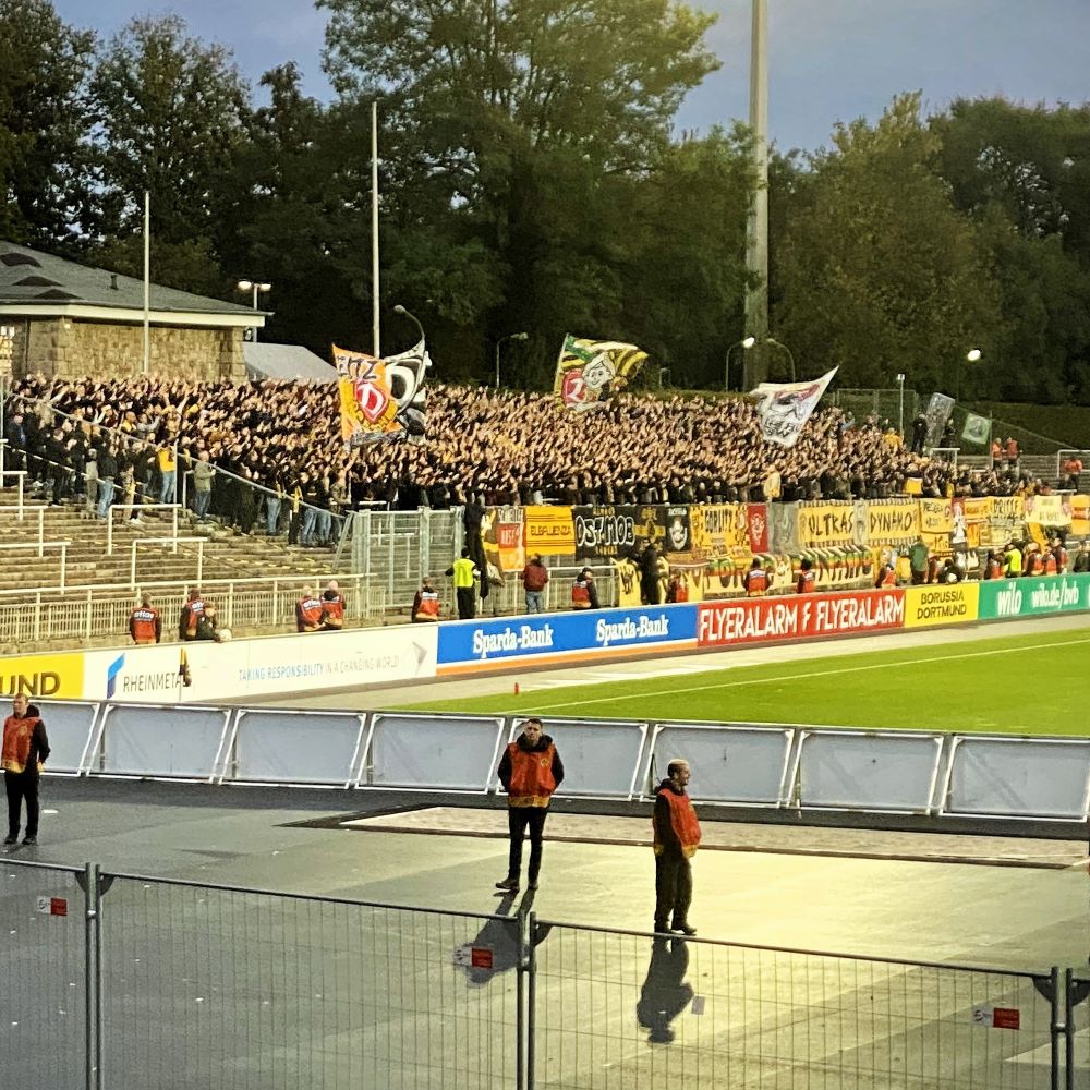 Um eine drohende Midlife Crisis zu verhindern, glich ich also meine Lücken in der Stadionlandschaft mit den Spielplänen ab und fand eine gute Gelegenheit endlich mal in Dortmunds Roter Erde aufzukreuzen. Dynamo Dresden sollte am Abend des 4. Oktober bei der Zweitvertretung des Ballspielvereins Borussia 09 antreten. Ein schwarz-gelber Ost-West-Gipfel einen Tag nach dem Tag der Deutschen Einheit. Was kann es schöneres geben? Erst recht, wenn nicht ins Westfalenstadion ausgewichen wird, sondern die altehrwürdige Rote Erde grünes Licht für dieses „Risikospiel“ bekommt und es bei Borussia I und II keine Terminüberschneidung gibt.