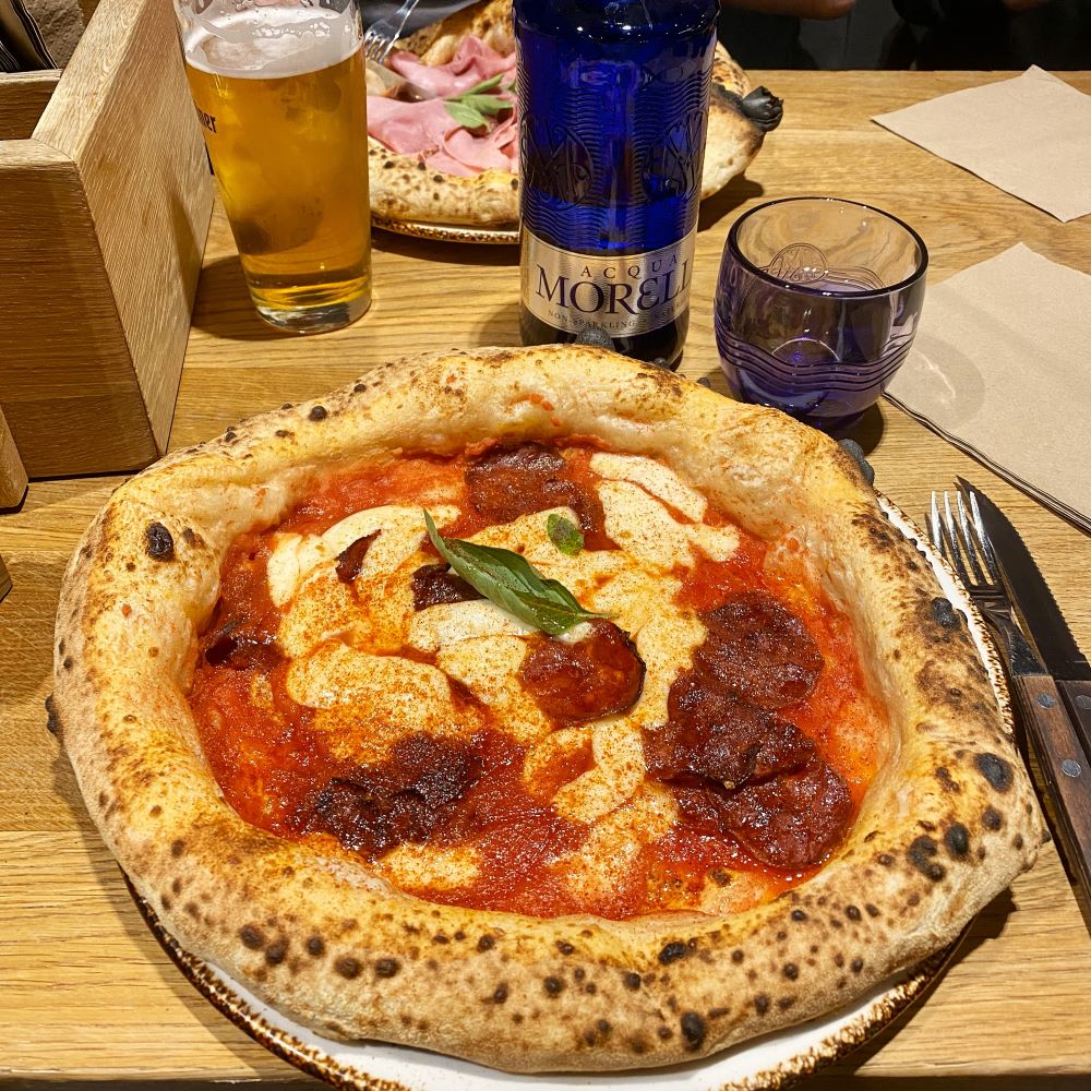 Da mein InterCity nach Hannover erst gute 1,5 Stunden nach Abpfiff in Dortmund abfahren sollte, ließ ich mich von Jan, Max und Kaja gerne noch in die Dortmunder Innenstadt zu 60 Seconds to Napoli mitschleppen. Dort hatte das Trio schnell die jeweilige Lieblingspizza gefunden und bestellt, nur ich bekam ungeahnte Probleme. Die von mir erwählte Nonnas Bolognese mit laut Speisekarte 24 Stunden lang geschmorter Rinderbolognese, Parmigiano Reggiano und Rosmarin war leider aus. Bei meinem Zweitwunsch The Beast (Tomatensauce, Bresaola vom Black Angus, Parmigiano Reggiano, Kirschtomaten und Fior di Latte) wieder ein Kopfschütteln der Kellnerin. Okay, dritter Versuch mit der Don Diablo (Tomatensauce, Chorizo de Bellota, Fior di Latte, Chili-Honig und geräuchertes Paprikapulver). Deren Zutaten waren anscheinend noch allesamt vorhanden und sie kostete mit 16 € sogar zwei Euro weniger als die anderen beiden. Geschmacklich war sie eigentlich auch ganz okay, aber mich störte die Süße des Honigs. Den hatte ich in der plötzlichen Drucksituation auch einfach überlesen.