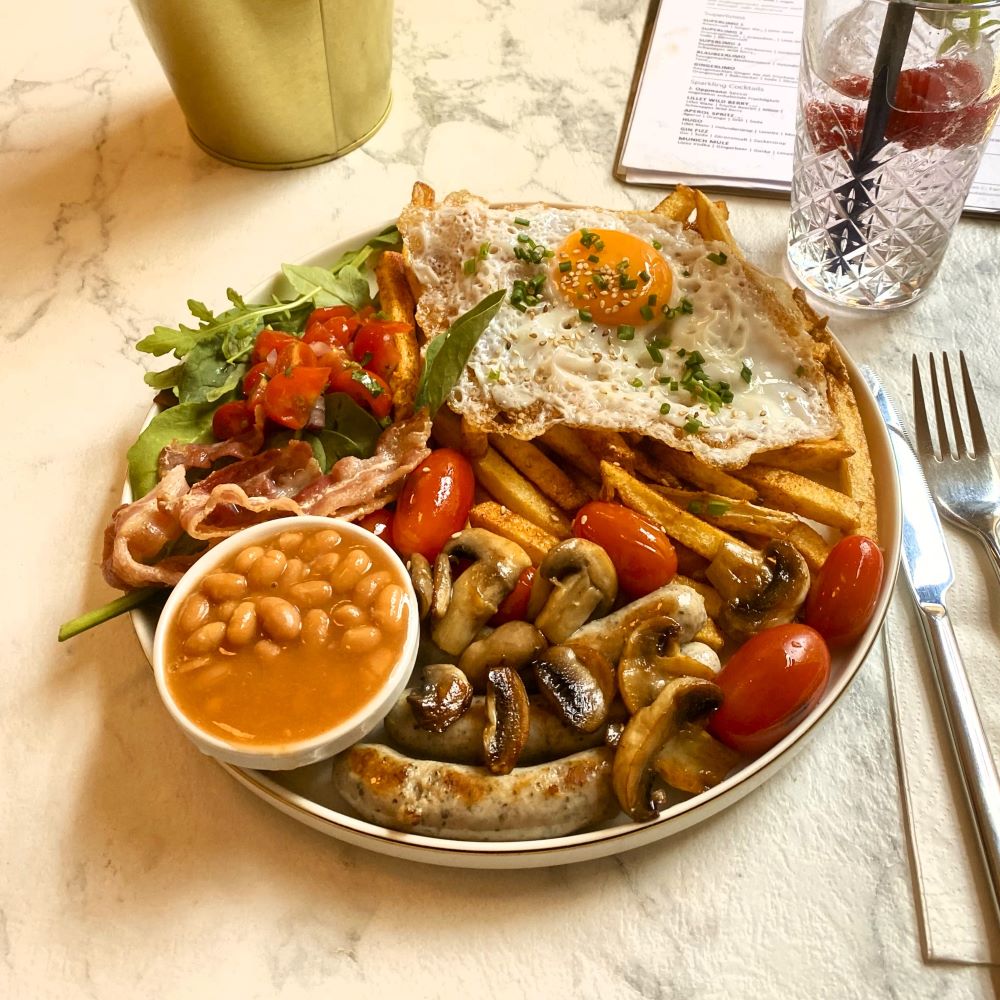 Also wurde sich erstmal um ein spätes Frühstück gekümmert. Die Wahl fiel auf das The Shabby, welches unweit der Uni zu finden ist. Die richten sich konzeptionell bewusst an Studenten und andere Langschläfer, welche auch mal erst am frühen Nachmittag lecker dejeunieren wollen. In der großen Auswahl entschied ich mich dort für das Katerfrühstück mit Nürnbergern, Grillspeck, Spiegelei, Bohnen, Pilzen, Salat und sehr geilen hausgemachten Fritten (14 €), sowie die so genannte Superlimo mit Himbeeren und Basilikum (5 €).