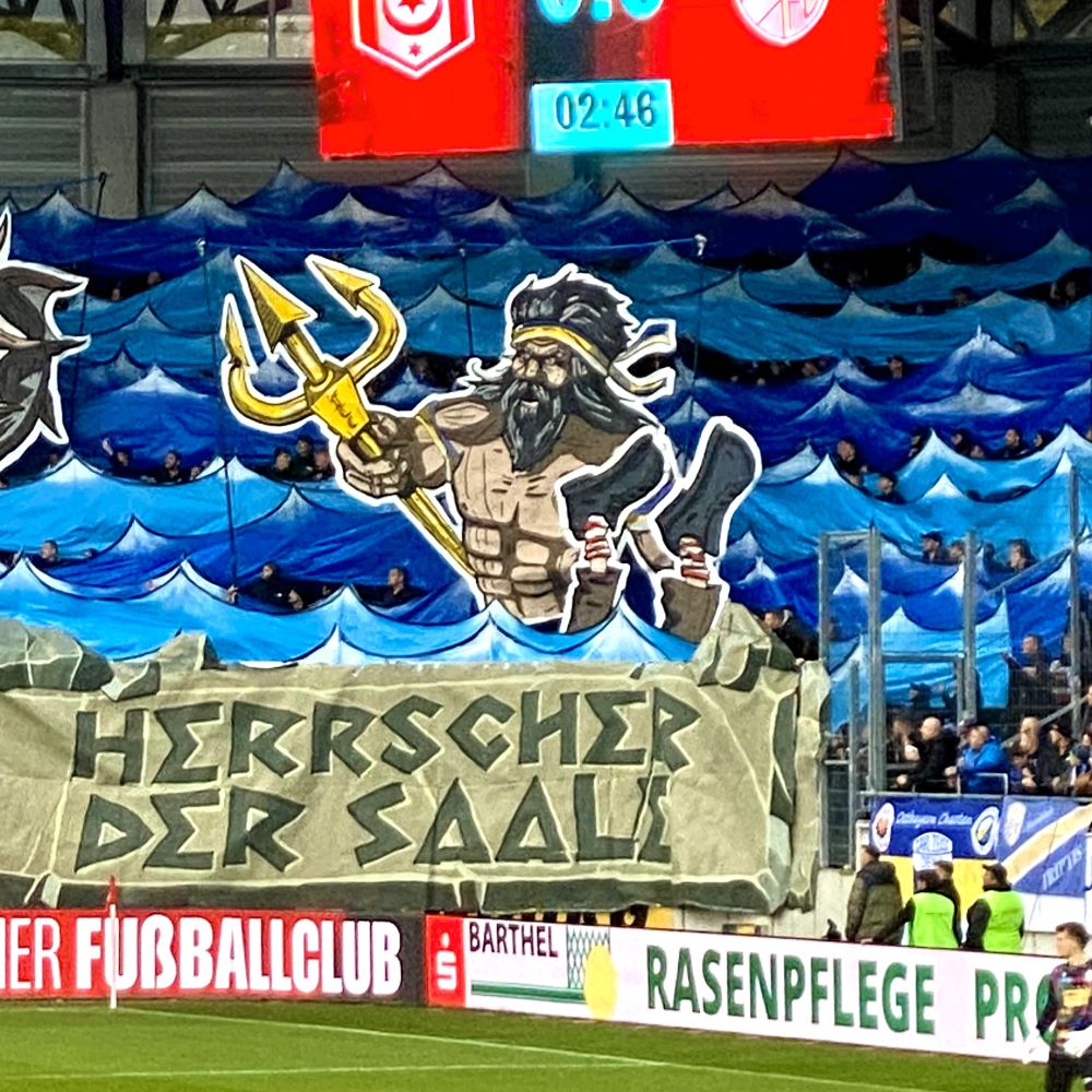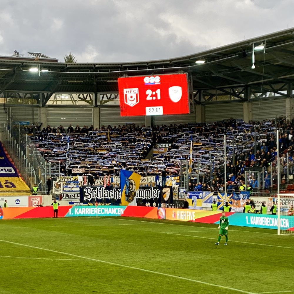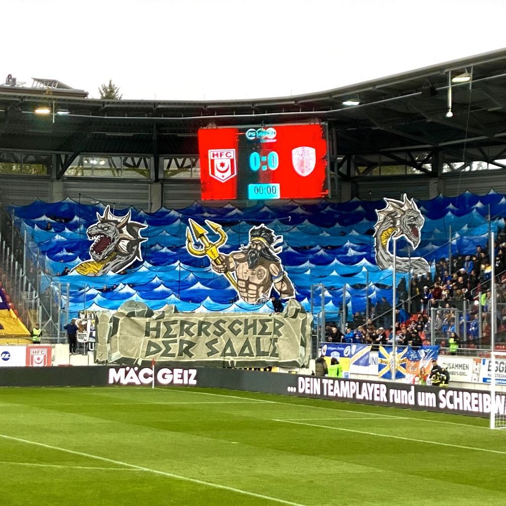 Ich glaube „Ausgerechnet der Löhmannsröben“ schoss daher beim Gegentor kaum einem Zeisser durch den Kopf. Stattdessen bewegte die Fans aus Jena vielmehr, dass ihre Vereinslegende Mark Zimmermann seit Sommer Cheftrainer beim HFC ist. Denn der hatte von 1988 bis 1998 und anschließend nochmal von 2004 bis 2008 die Stiefel für den FCC geschnürt. Außerdem bekleidete er von 2008 bis 2018 verschiedene Trainerposten im 1903 als Werksclub der Fa. Carl Zeiss gegründeten thüringischen Traditionsverein. Kurz vor Spielende wurde diese Causa sogar noch per Tapete im Gästeblock thematisiert.