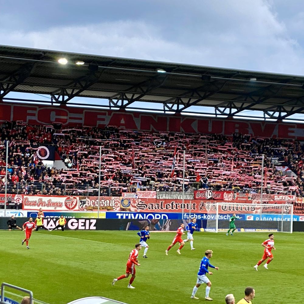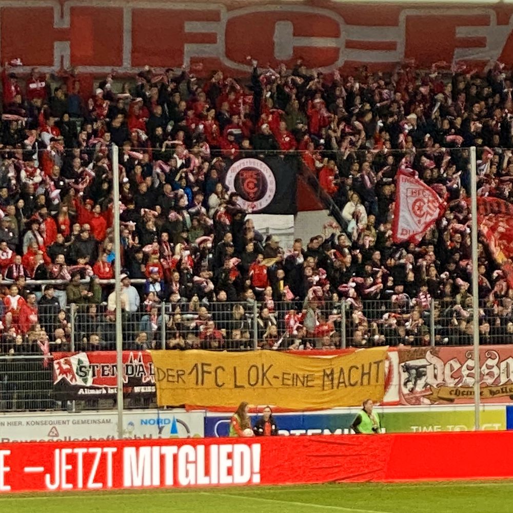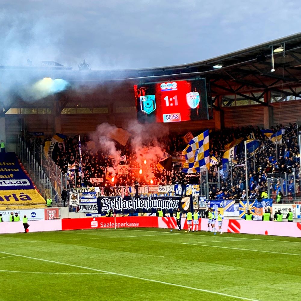 Auf dem Rasen machte der Drittligaabsteiger aus der Händelstadt derweil die Pausenführung fest, musste jedoch in der 58. Minute den Ausgleich hinnehmen. Kapitän Nils Butzen brachte den gegenwärtigen Tabellenzweiten ebenfalls mit Köpfchen zurück ins Spiel und rannte zum Jubeln einer vor Freude partiell leuchtenden Gästekurve entgegen. Überhaupt entzündeten die Schlachtenbummler aus Thüringen im zweiten Durchgang immer mal wieder eine Fackel zur Begleitung ihres gewohnt abwechslungsreichen Liedguts.