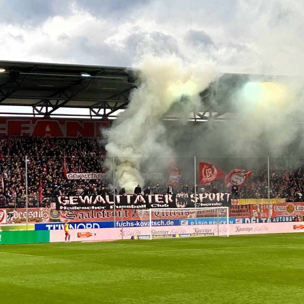 Diese Entwicklung rief den sozusagen betroffenen Teil der HFC-Szene auf den Plan, der heute mit der entsprechenden Zaunfahne, einer Banderole („Gewalttäter Sport. Auch ohne Datei!“) und einer Rauchsäule unmissverständlich klar machte, dass sie auch ohne die identitätsstiftende Polizeidatei so genannte Gewalttäter Sport bleiben werden. Ist die Betitelung der Datei doch ähnlich wie der ebenfalls behördlich ersonnene Begriff Kategorie C zur stolzen Eigenbezeichnung der gewaltaffinen Fans in Halle und anderswo geworden.