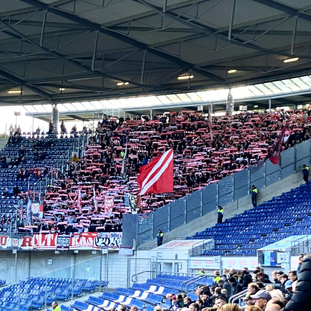 14:45 Uhr und somit eine Viertelstunde vor Abpfiff ging es schließlich durch ein Drehkreuz des 1923 eröffneten und 2010/11 quasi komplett neu gebauten Kurt-Wabbel-Stadions. Ich hatte mir für 25 € ein schönes Plätzchen auf der Haupttribüne gebucht und von dort die Kurven gleichermaßen gut im Blick. Im Gästesektor wurde außerdem schon fleißig eine Choreographie vorbereitet, deren Durchführung wenig später in mehreren Akten erfolgte.