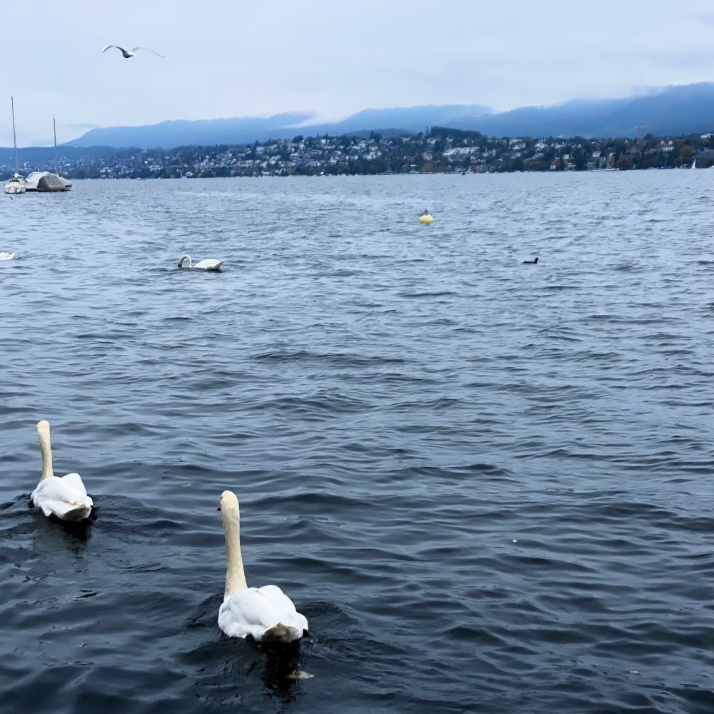 Anschließend wollten wir dem Körper noch ein paar Kilokalorien aus der Dose zuführen, wofür wir uns mit eiskalten Feldschlösschen im Coop neben dem Sternen Grill eindeckt hatten. Mit dem Haupterzeugnis der umsatzstärksten Brauerei der Schweiz ließen wir uns am nahen Ufer des Zürichsees nieder. Weil die Sonne sich heute nicht über der größten Stadt des Landes (ca. 400.000 Einwohner) blicken lassen wollte, leider mit eingeschränktem Panorama. Aber immerhin war es trotz der vielen Wolken trocken und relativ warm, so dass wir bei weitem nicht die einzigen Ufergäste am heutigen Nachmittag waren.