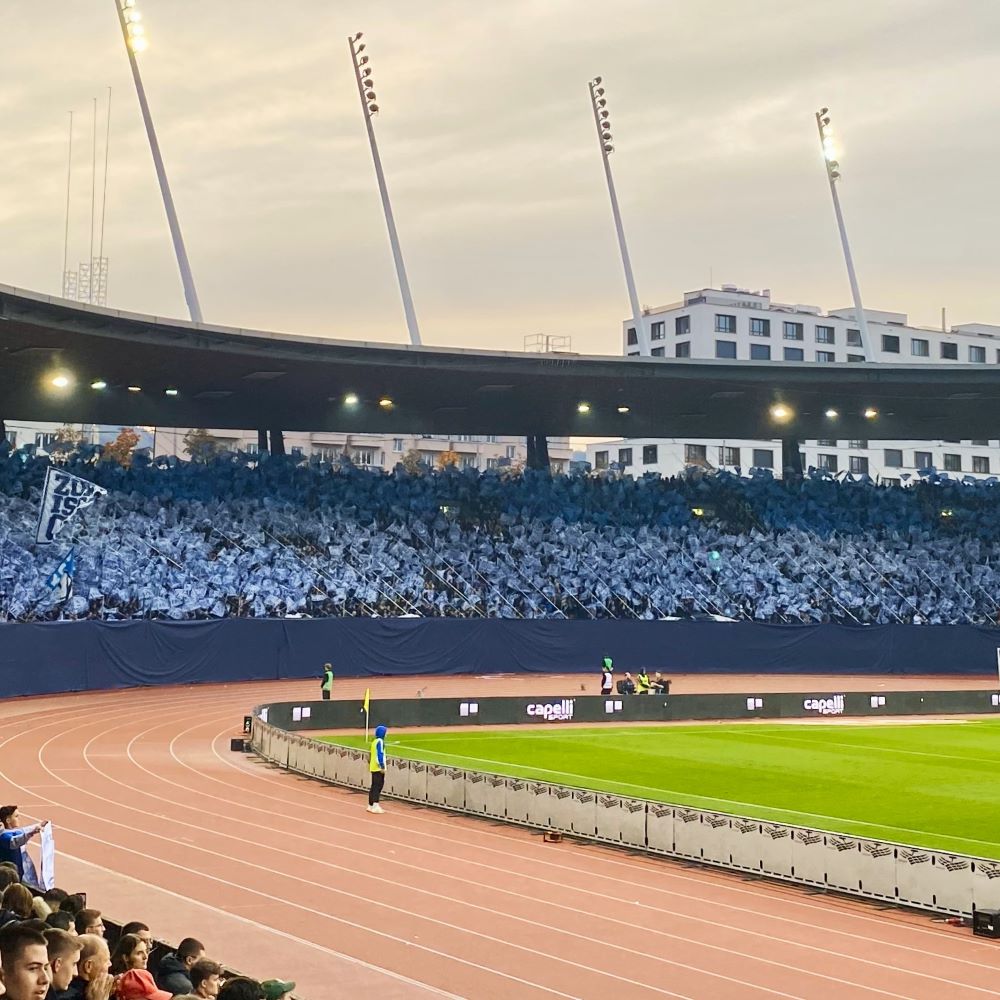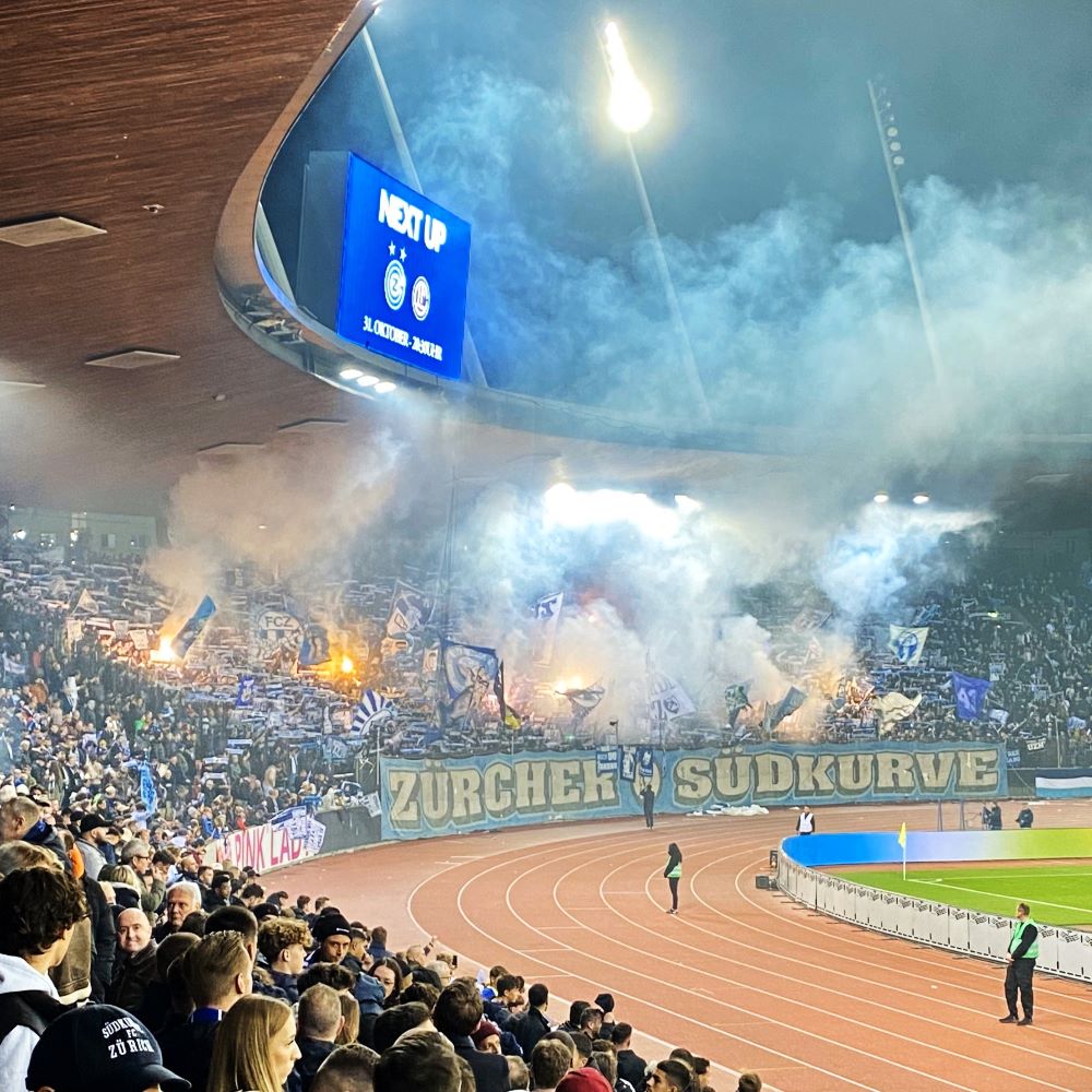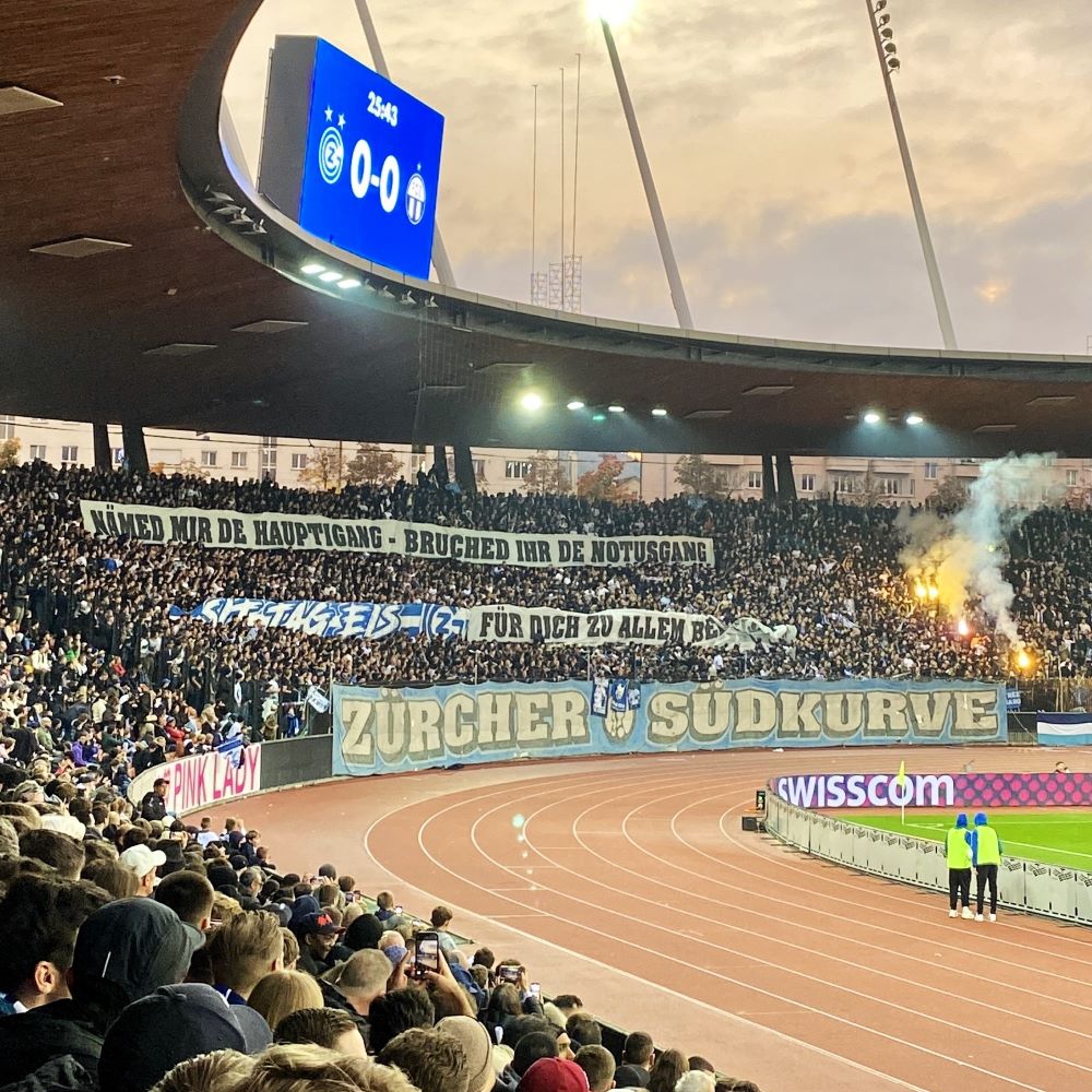 Gegenüber hatte die Zürcher Südkurve auch ein choreographisches Statement zu Spielbeginn. Dieses lautete „Ei Stadt, ein Verein“ und war in Form von großen Buchstaben über die Ränge gespannt. Dazu wurde noch das Vereinswappen entrollt und alles mit lauter kleinen Fähnchen garniert. Damit machte man einmal mehr unmissverständlich klar, dass es im eigenen Selbstverständnis nur einen Verein in Zürich gibt.