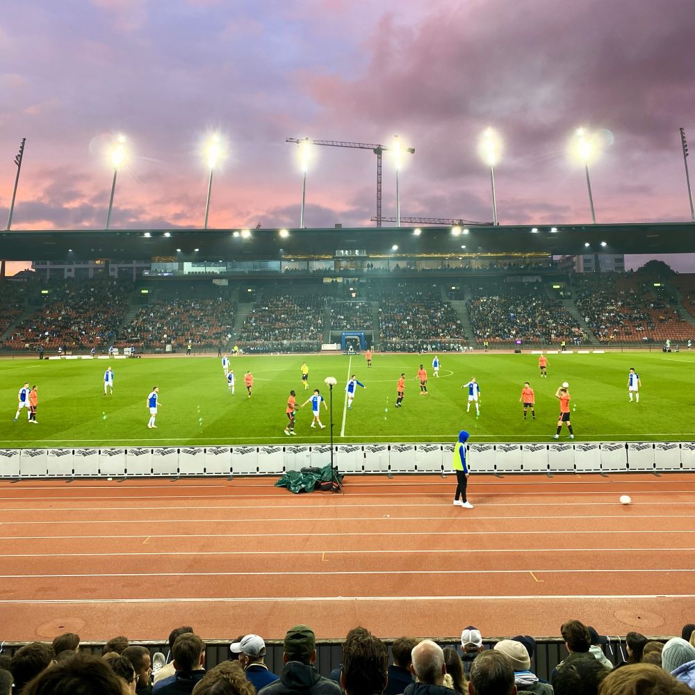 Dann ging es mit der Tram in Richtung Letzigrund, wo wir gegen 17:45 Uhr und somit eine Viertelstunde vor Anpfiff eintrafen. Ich hatte uns im Vorverkauf mit Karten für die Gegengerade auf Höhe der Mittellinie à 42,50 CHF (ca. 45 €) versorgt und von diesen Topplätzen konnten wir sowohl das Spielgeschehen, als auch das Treiben in den Kurven optimal verfolgen.