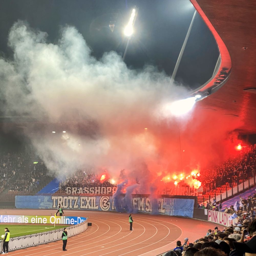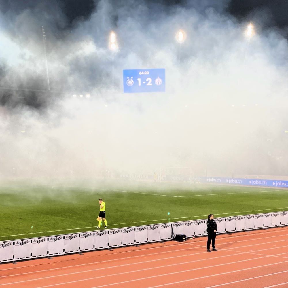 Aber die 2. Halbzeit, welche der Anhang des Rekordmeisters mit einem schicken Feuerwerk einleitete, sollte sich anders gestalten. Der FCZ begann passiver und verlor zunehmend die Spielkontrolle. Nachdem GC-Trainer Marco Schällibaum nach einer Stunde schließlich einen offensiven Dreifachwechsel vollzog, fiel sodann der mittlerweile verdiente Anschlusstreffer. Der just ins Spiel geworfene Awer Mabil konnte eine abgefälschte Flanke mit der Brust über die Torlinie drücken (61.) und jetzt fackelte der „Heimanhang“ natürlich ordentlich was weg. An eine Spielfortsetzung war erst zu denken, als der Nebel hinreichend in den Nachthimmel gezogen war.