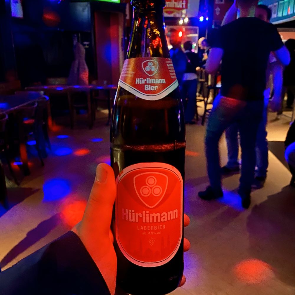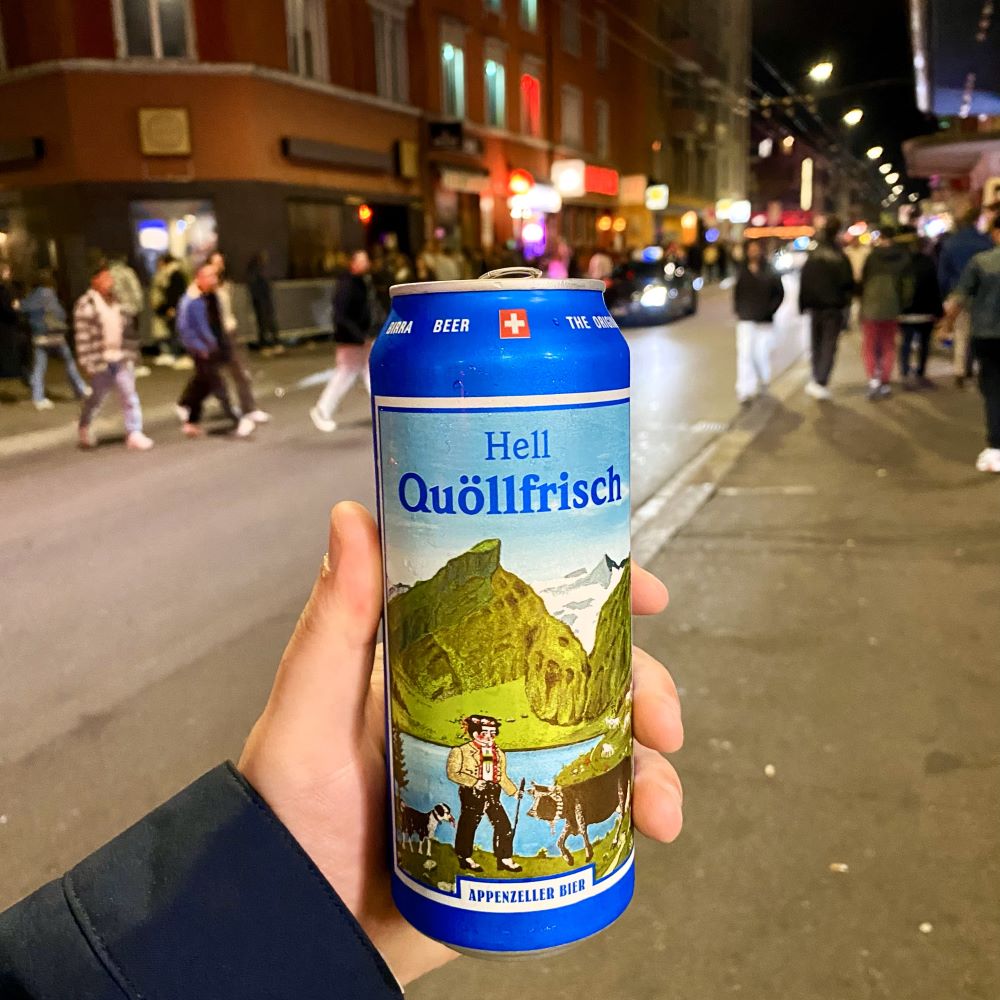 Als sich das Stadion schließlich so langsam leerte, ging es für uns erstmal wieder in die nahe Unterkunft. Dort wartete eiskaltes Quöllfrisch auf uns. Bewaffnet mit ein paar Kannen davon sollte es zeitnah in die Langstrasse gehen. Wir flanierten Zürichs Amüsiermeile einmal auf und ab und kehrten nach dem Leeren der Quöllis ins Strauss ein. Eine alteingesessene Beiz in diesem Kiez, wo man uns halbe Liter Hürlimann in der Flasche à 5 CHF (ca. 5,30 €) über die Theke reichte. Weil dort ein Glücksspiel namens Subito beworben wurde, erzählte ich Johnny im Strauss außerdem noch ein bisschen von den Jugendunruhen in Zürich anno 1980 („Wir wollen alles, und zwar subito!“ war ein Leitspruch der seinerzeit gegen die stockkonservative Schweizer Obrigkeit aufbegehrenden Jugend).