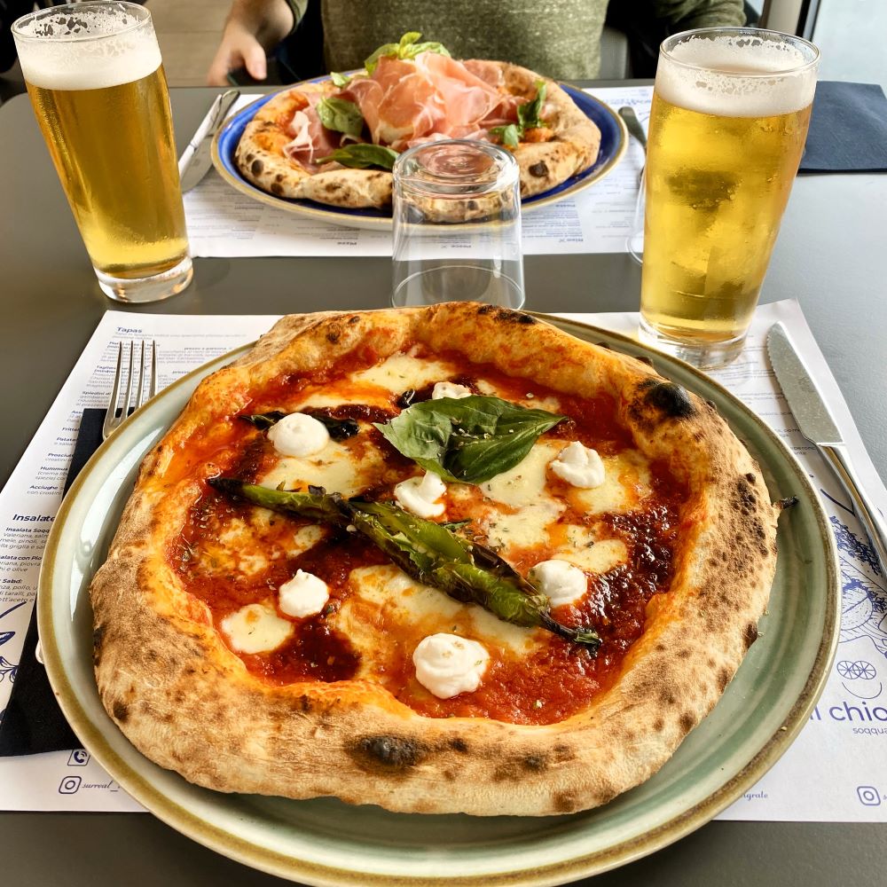 Da bald alle Lokale schließen würden, musste nach dem Bezug der Unterkunft als nächstes ein Mittagessen her. Fast alle Optionen an der Uferpromenade hatten gegen 14:30 Uhr auch tatsächlich schon schon ihr Mittagsgeschäft beendet. Doch im Ristorante Soqquadro waren noch ein paar Tische besetzt und auf Nachfrage versicherte man uns, dass der Pizzaofen noch glüht. So gab es wenige Minuten später für Johnny eine Vesuvio mit Tomate, Mozzarella, Basilikum und einem Berg Prosciutto crudo. Ich bekam hingegen eine Calabra mit Tomate, Mozzarella, Nduja (pikante Streichwurst aus Kalabrien), Ricotta und einer höllisch scharfen Spitzpaprika serviert. Ferner gab es für jeden noch 40 cl Schweiger Bräu vom Fass und mit Coperto wurden uns letztlich für alles zusammen 45 € berechnet.