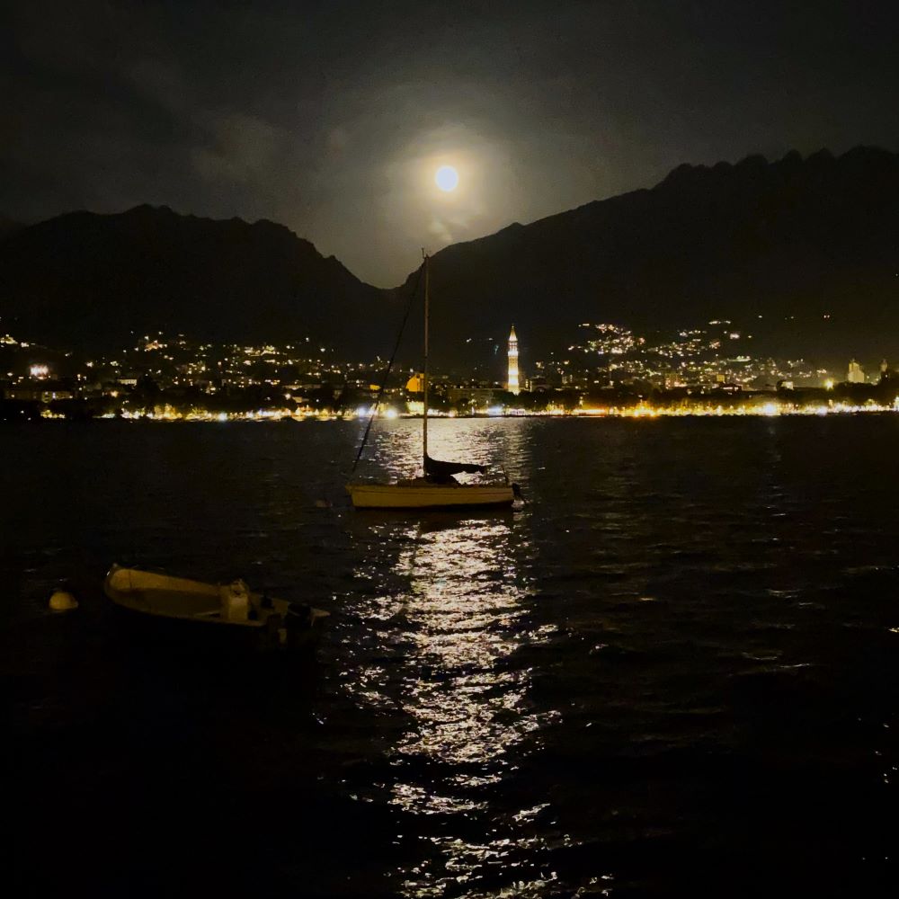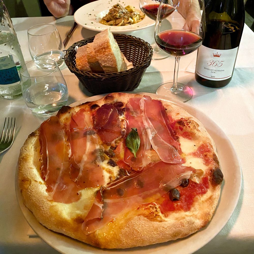 Nach dem Spiel gönnten wir uns nochmal ’ne Rutsche Bier an der Stadionbar und danach ging es wieder runter ans Seeufer. Nach Sonnenuntergang folgten wir dann der Pizzaempfehlung von Nunzias Mann und gingen ins nahe Restaurant Covo Nord Ovest. Während Johnny sich für seiner Aussage nach eher mittelmäßige Tagliatelle ai funghi porcini entschied, hatte ich kein Problem mit einer zweiten Pizza an diesem Tag. Es wurde die Trentino, die mit Tomate, Mozzarella, Pilzen, Oliven, sowie mit Rohschinken aus der namensgebenden Region belegt war und geschmacklich sogar die bereits gute Pizza vom frühen Nachmittag toppte. Zusammen mit einer Flasche Rotwein aus dem nahen Valtellina (Veltlin), zwei Flaschen Wasser, Coperto und einem kleinen Trinkgeld waren wir am Ende des Abends übrigens faire 70 € los.