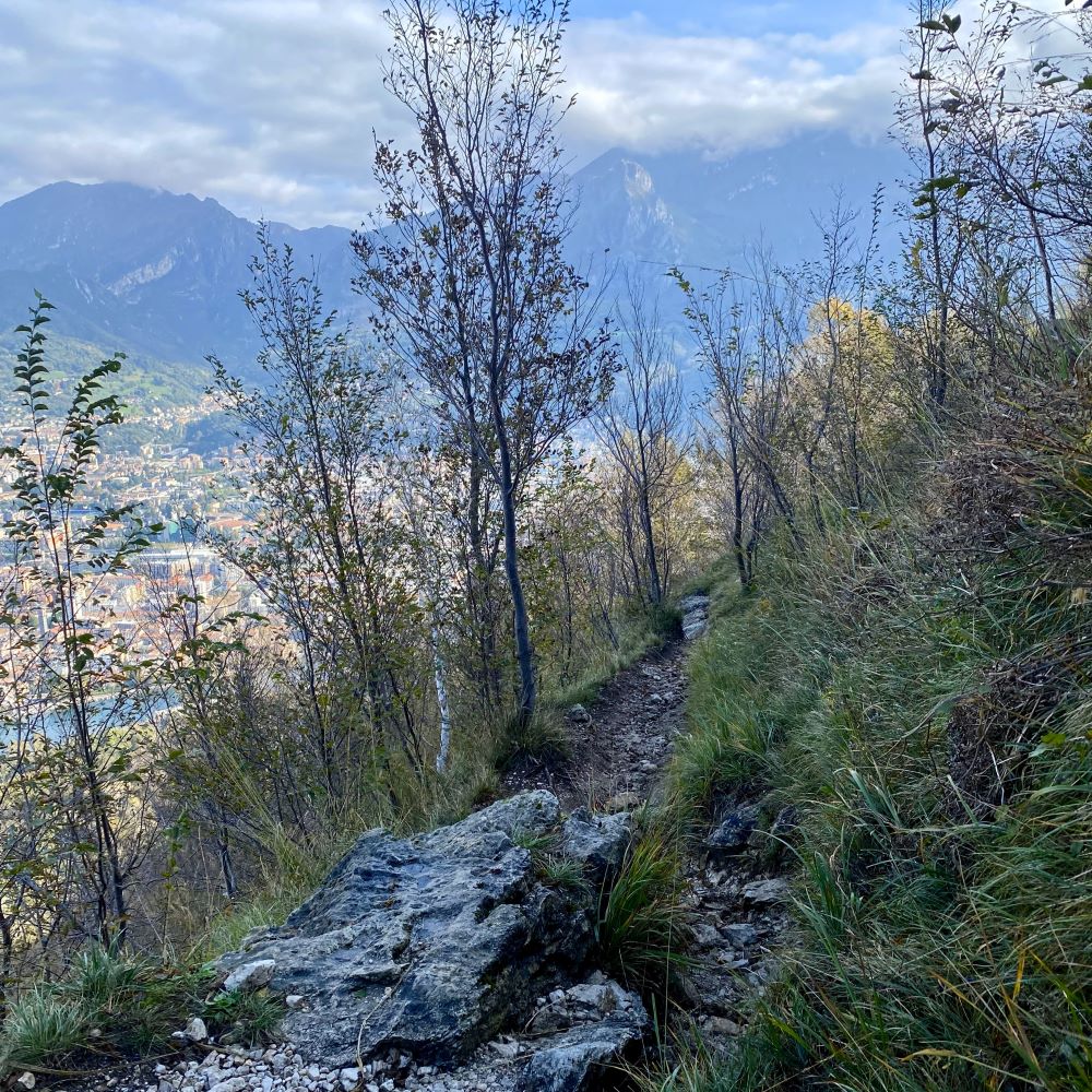 Auf gerade mal 1,5 weiteren Wanderkilometern hatten wir bereits stolze 360 Höhenmeter gemeistert und machten unterhalb des Gipfels auf ca. 610 m ü. NN bei herrlichem Ausblick (siehe Titelbild) die erste Pause der Tour. Zum Gipfel wären es von unserem Pausenplatz nochmal 1,5 km (und über 300 Höhenmeter) durch alpines Gelände gewesen. Da war es nach der Rast zu verlockend, lieber auf dem Panoramaweg Sentiero di Mezzo (Mittelweg) rund um den Gipfel zu wandern und auf der anderen Seite des Monte Barro auf einem gut ausgebauten Weg abzusteigen.