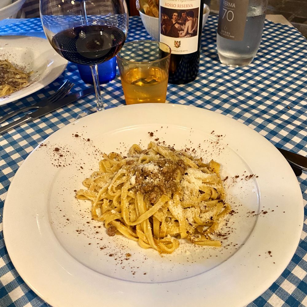 Nach den Duschbädern wurden revitalisierende Biere am Seeufer genossen und anschließend prüften wir die Osteria Era Ora an der Promenade von Malgrate. Dort hatten wir uns neben Wein, Wasser und Brot auch jeder zwei Gänge verdient und begangen den Schmaus übereinstimmend mit Tagliatelle con ragù di cinghiale alla bracconiera. Ebenfalls im Gleichklang lobten wir das gereichte Pastagericht mit der kräftigen Wildschweinsauce in den höchsten Tönen.