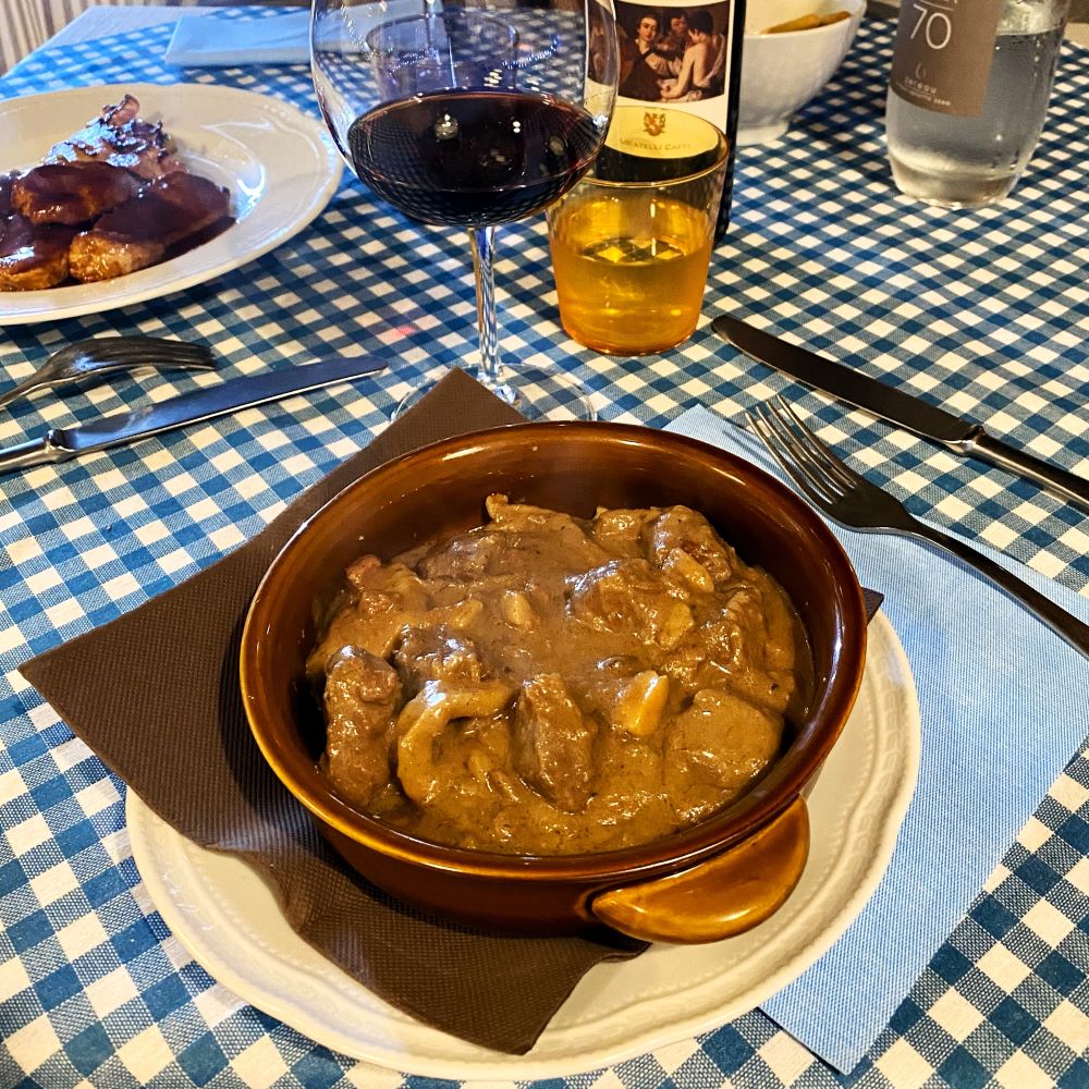 Beim zweiten Gang kamen unterschiedliche Gerichte an den Tisch. Bei mir blieb es mit Cinghiale con polenta e funghi (Wildschweingulasch mit Polenta und Pilzen) wild, während Johnny sich für die domestiezierte Verwandschaft entschied und Filetto di maiale con bacon e rosti in salsa al miele affumicata (Schweinefilet mit Speck, Rösti und Barbecuesauce) bestellte. Außerdem teilten wir uns noch eine Portion Patate arrosto (Röstkartoffeln mit Rosmarin) und eine Flasche Valcalepio Rosso Riserva (ein sehr trockener und kräftiger Rotwein aus der Region Bergamo, der gut zu beiden Hauptgerichten passte).