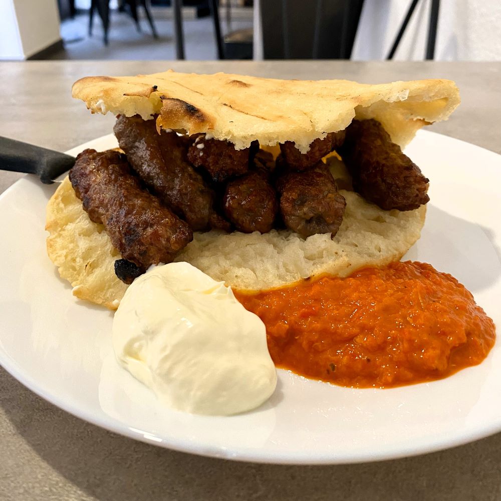 Da ich am Donnerstagvormittag eine einigermaßen stressfreie Anreise mit dem Deutschlandticket erwartete, verzichtete ich auf ein kurz vor Reiseantritt doch relativ teures ICE-Ticket und fuhr 7:37 Uhr via Elze, Göttingen und Kassel nach Frankfurt. Off-peak waren die Nahverkehrszüge natürlich schön leer, nur leider verhagelte mir eine Stellwerksstörung den Anschluss in Kassel*. Deshalb kam ich erst 13:38 Uhr und somit eine Stunde später als geplant an meinem Zielbahnhof an. Dort organisierte ich mir als erstes ein Mittagessen. Beste Option in der Frankfurter Bahnhofsgegend: Čevabdžinica Sarajevo. In diesem bosnischen Grillimbiss gönnte ich mir acht Ćevapčići mit Lepinja, Ajvar und Kajmak für faire 8 €.
