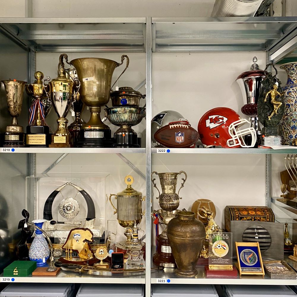Im Archiv sind die mittlerweile über tausend Geschenke geographisch geordnet, weshalb nach den Regalen mit Präsenten der DFB-Pokal-Finalisten eine spannende Weltreise über alle Kontinente begann. Zugleich war es natürlich eine interessante Zeitreise. Denn viele der Aufmerksamkeiten verrieten auch etwas über ihren zeitgeschichtlichen Hintergrund (z. B. die Geschenke der sozialistischen Verbände an den DFB).