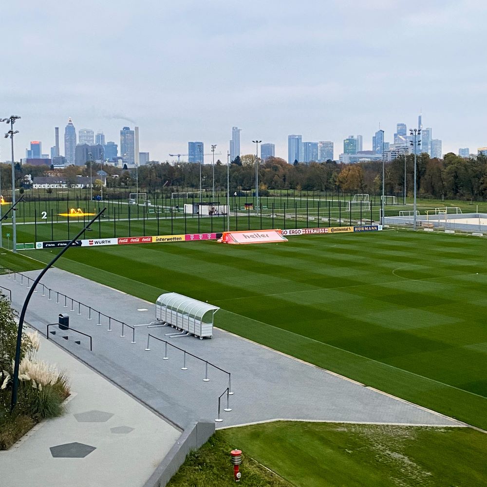 Nach diesem köstlichen Mahl checkte ich ins pro Nacht 65 € teure Bristol Hotel (****) ein und um 15 Uhr hatte ich eine Verabredung mit einem seit einigen Jahren in Frankfurt arbeitenden Kumpel. Der hatte zwar am Abend einen Konzertbesuch geplant (Wanda in Wiesbaden) und am Freitag eine Dienstreise im Kalender, aber er bot mir an ihn Donnerstagnachmittag einfach an seinem Arbeitsplatz zu besuchen. Sein Brötchengeber hat den klangvollen Namen Deutscher Fußball Bund und befindet sich seit Juni 2022 auf dem früheren Gelände der Galopprennbahn Niederrad. Für ca. 150 Mio € ist dort der so genannte DFB-Campus entstanden, der einerseits das neue administrative Zentrum des DFB ist und anderseits auch über eine eigene Sportinfrastruktur für DFB-Teams verfügt.