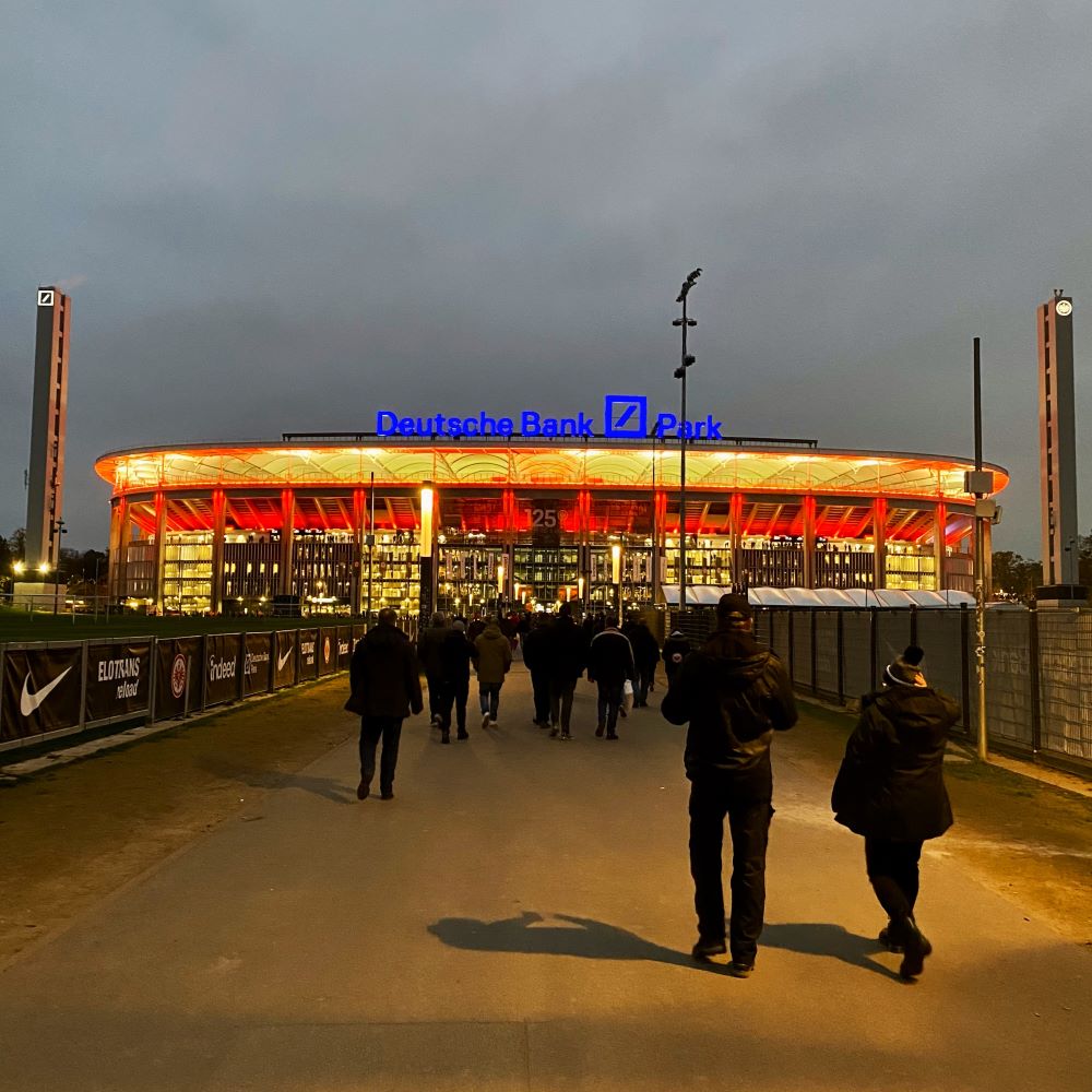 Als ein Espresso das exzellente Abendmahl abgerundet hatte, war ich dem Restaurant für drei Gänge und drei Getränke bescheidene 61,70 € schuldig. Nachdem die nebst Trinkgeld entrichtet waren, ging es umgehend den steilen Bornheimer Hang hinab zum gleichnamigen Stadion. Übrigens 1931 eröffnet und seitdem die Heimat des am 20. August 1899 gegründeten Fußballsportverein Frankfurt.