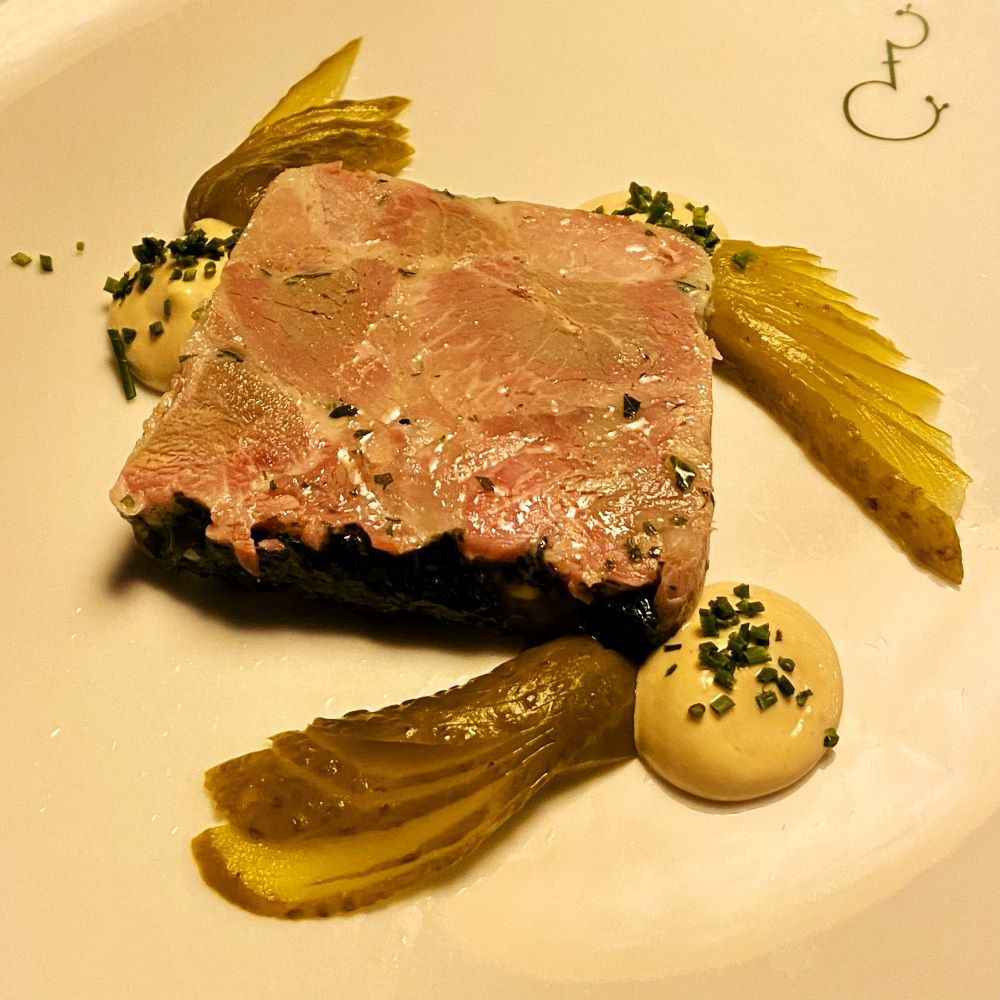 Nachdem man mich platziert hatte, studierte natürlich sofort die heutige Tageskarte. Drei Gänge mit Getränkebegleitung durften es gerne werden und den Einstieg wagte ich mit einem großen Glas Apfelwein der Griesheimer Kelterei Nöll und einer Jambon persillé. Diese Terrine aus zart gekochtem Schweinefleisch war wunderbar mit Petersilie und ein paar Gewürzen aromatisiert und wurde zusammen mit Cornichons und einer Senfcreme serviert. Als weiteren Begleiter gab es hausgebackenes Sauerteigbrot, welches ebenfalls hervorragend mundete.