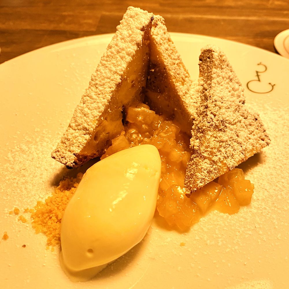 Anschließend wurde mir als Dessert der so genannte Scheiterhaufen serviert. Das war hausgebackenes Sauerteigbrot vom Vortag, welches in einer Masse aus Milch, Ei und Gewürzen eingeweicht und anschließend nochmal im Ofen gebacken wurde. Dieses saftige Gebäck wird im Ratskeller mit einer Kugel Schmandeis und einem Apfelkompott begleitet. Auch alles äußerst delikat.