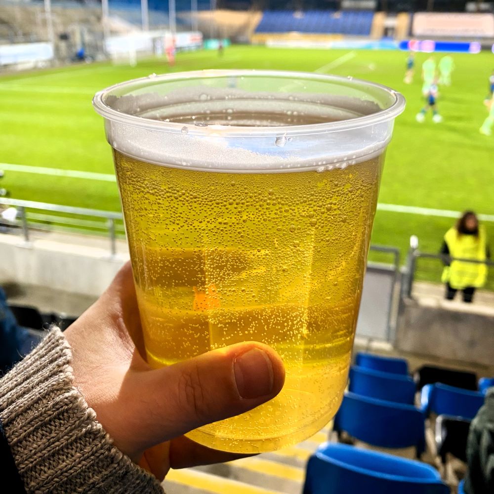 DFB und Eintracht Frankfurt sind zwar durch den Neubau in Niederrad keine direkten Nachbarn mehr, aber auch die neue Verbandszentrale ist gerade 1,7 km vom 1925 eröffneten und für die WM 2006 grundlegend modernisierten Waldstadion entfernt. Entsprechend ging ich zu Fuß und spazierte eine gute Stunde vor Anpfiff durch’s Drehkreuz. Genug Zeit, um im Umlauf des Stadions erstmal eine komplette Runde zu drehen und außerdem noch einen kleinen Abendsnack zu genießen (Rindscurrywurst und Cola für zusammen 9,70 €).