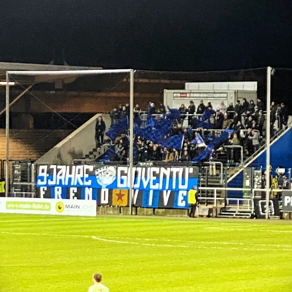 In der Halbzeitpause versorgte ich mich mit einem Literpott Ebbelwoi (9,50 €) und hoffte auf einen weiterhin munteren Kick. Ferner wurde der zweite Durchgang mit einer kleinen Aktion der Gruppe Gioventù eingeleitet. Ein Banner wies auf den eigenen 9. Geburtstag hin und hatte Begleitung von ein paar blau-schwarzen Handschwenkern. Ansonsten gab es für FSV-Fans aber nichts mehr groß zu feiern. Die 2. Halbzeit sollte wesentlich ärmer an Torraumszenen werden und erst in einer etwas hitzigen Schlussphase hatten beide Teams nochmal den Siegtreffer auf dem Fuß. Ein Torerfolg blieb jedoch hüben wie drüben aus.