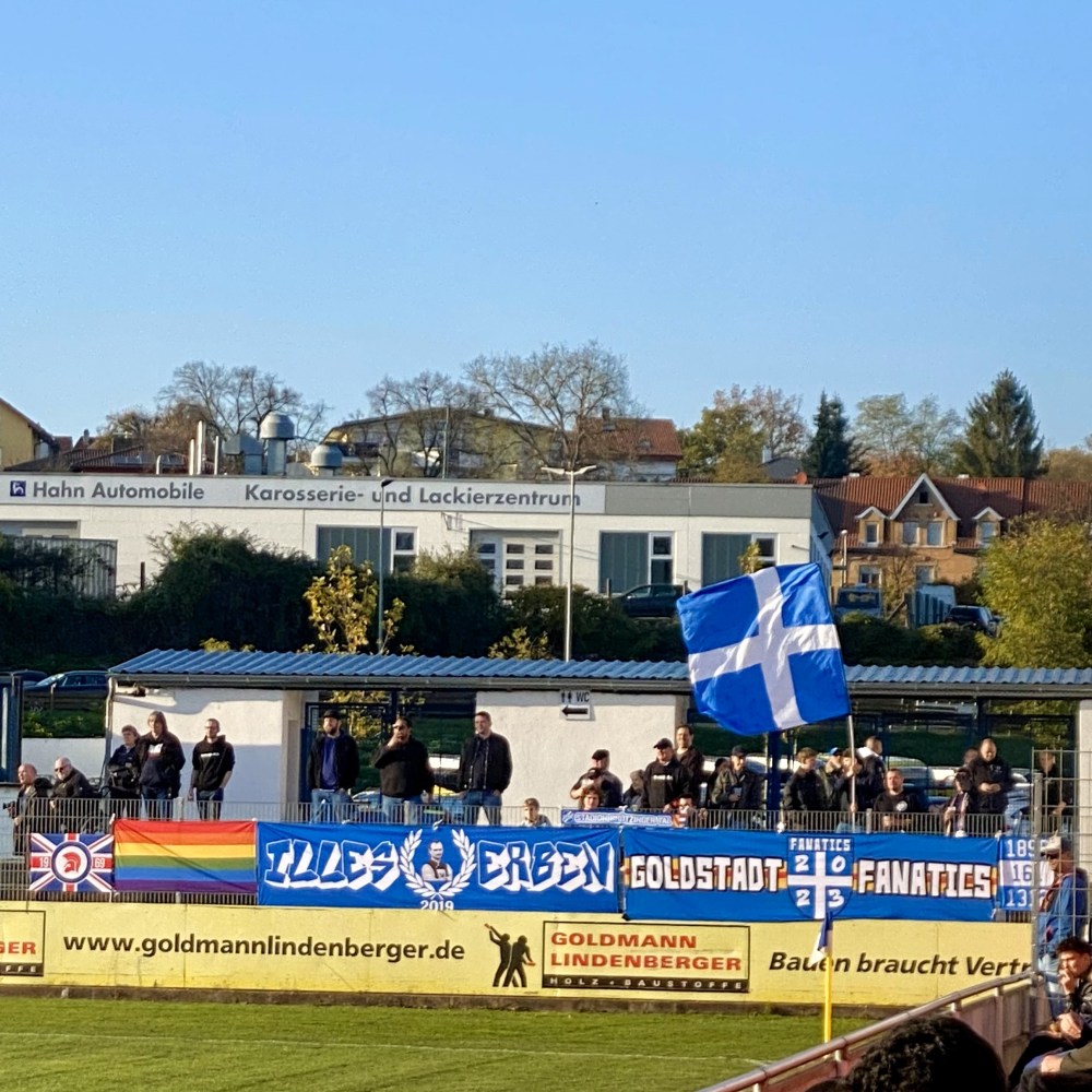 Letztlich sollten wir das am Ufer der Enz gelegene Stadion erst zur 30. Minute erreichen. Der Gastgeber lag durch Tore von Yunus Kahriman (10.) und Konstantinos Markopoulos (18.) schon 2:0 vorn und wir beschlossen das Spiel bis zum Halbzeitpfiff von draußen zu gucken. Das ist durch den Zaun neben dem Gästeblock tatsächlich ohne ernsthafte Sichteinschränkungen möglich. Wir lauschten nun also aus nächster Nähe den Gesängen der rund 125 mitgereisten Reutlinger. Die hatten zwar bis zum Ende des ersten Durchgangs nichts zu feiern, aber fingen sich immerhin auch kein drittes Gegentor.